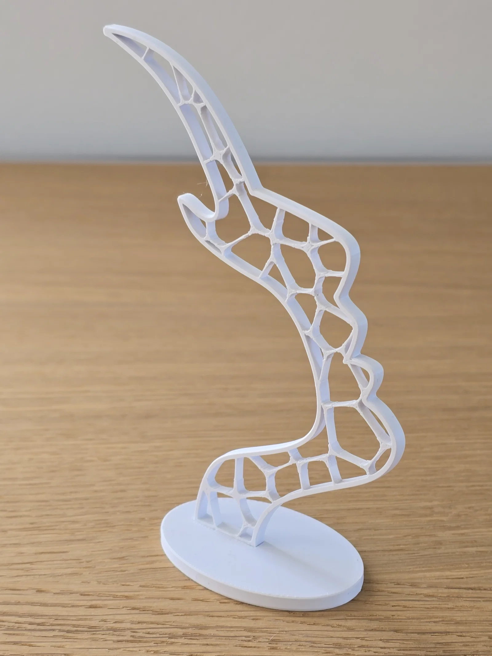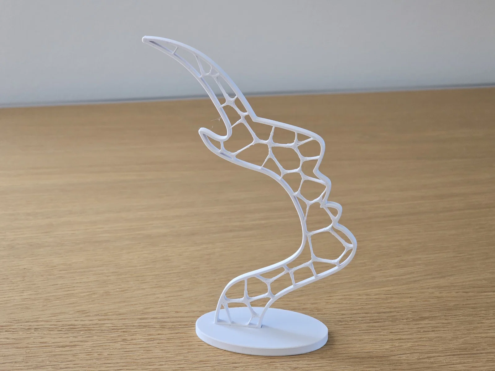 Cái kệ để mắt kính hiện đại với phong cách Voronoi của mình chỉ nặng có 9g và in cực kỳ nhanh. Phần khung (silhouette) sẽ cần hỗ trợ (support) khi in. Bạn chỉ cần dùng một giọt keo 502 để gắn phần khung vào chân đế là xong.