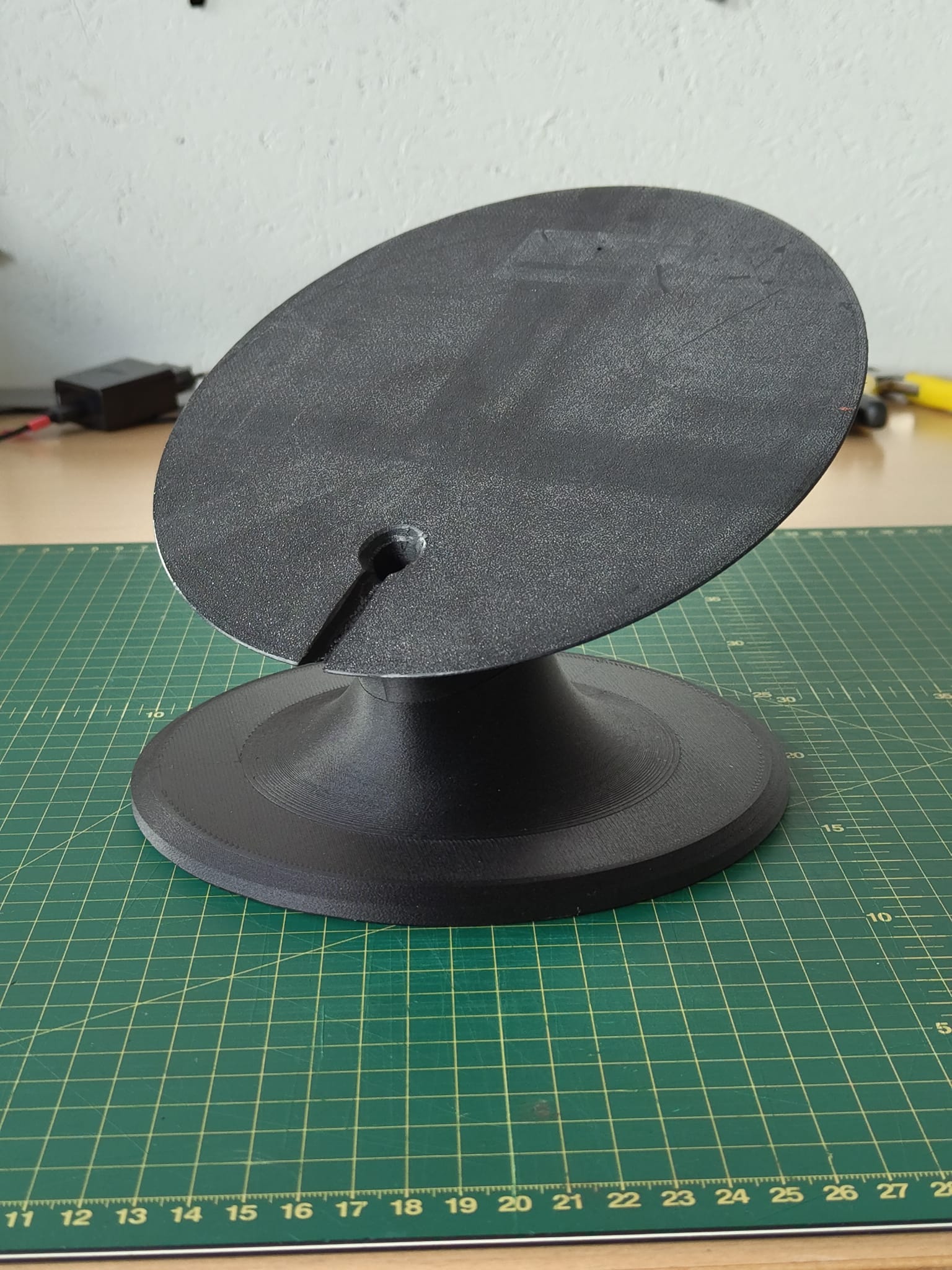 Vì chỉ có một chốt nên vị trí không được cố định hoàn toàn và chân đế có thể bị xoay lệch. Để khắc phục, bạn có thể cần thêm lỗ cho chốt/ốc vít hoặc dùng bạc đạn trong lỗ xuyên tâm. Tùy bạn nhé. :)