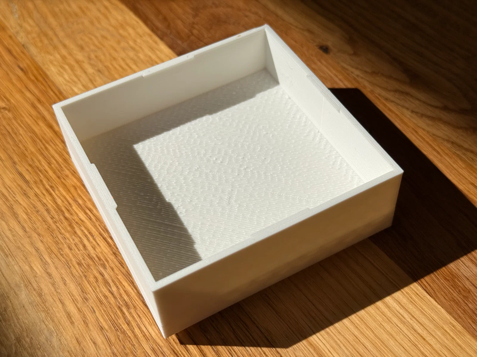 In bằng nhựa PLA trắng với độ infill 20% tiêu chuẩn là đủ cứng cáp rồi. Bạn nên in với mặt áp tường hướng xuống dưới và dùng thêm support để mặt trước được đẹp nhé.