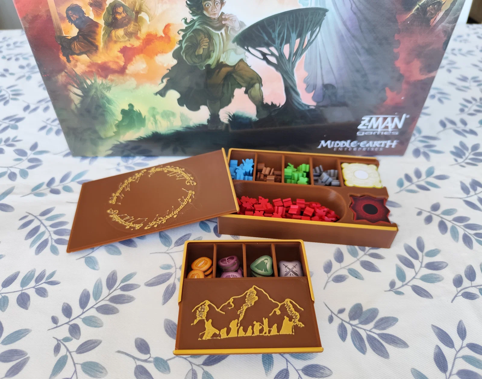 Vì thế, mình đã tạo thêm khay đựng Nazgûl để tận dụng không gian tốt hơn, làm các khay đựng bài có vách ngăn cho cả loại bài nhỏ và lớn (đều đã bọc sleeve), đồng thời thêm khay đựng bộ bài shadow có thể dùng ngay khi đang chơi. Mẹo nhỏ: file 3mf có bao gồm chữ khắc trên khay bài, bạn có thể chỉnh sửa, giữ lại hoặc xóa đi tùy ý.