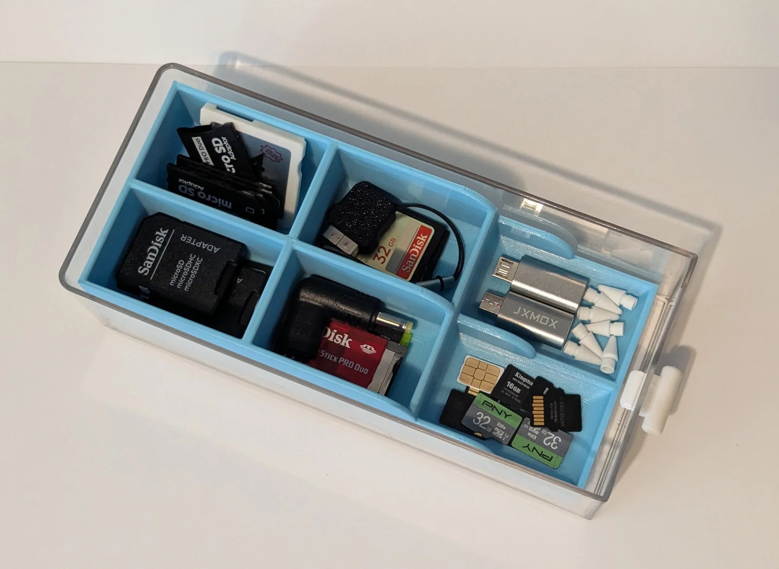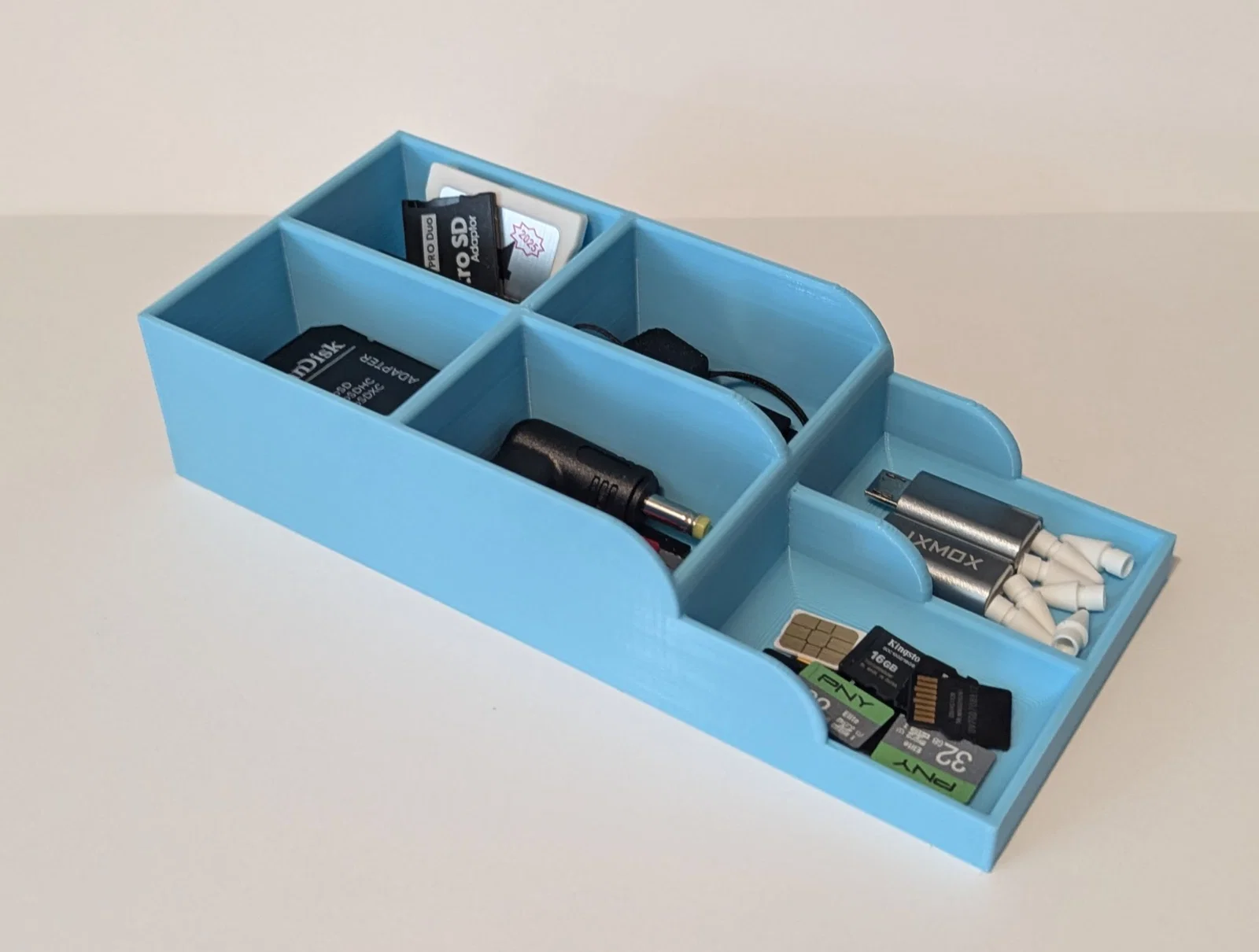 Mấy cái thẻ nhớ SD với mấy đầu chuyển đổi của mình cứ bị lộn xộn hết cả lên, nên mình đã thiết kế cái vách ngăn này cho hộp đựng đồ nhỏ để trên bàn làm việc. Nó vừa vặn hoàn hảo với hộp của mình, nhưng do mình mua cái hộp này đã lâu rồi nên các bạn nhớ đo lại kích thước hộp của mình trước khi in cho chắc ăn nha. Bạn cũng có thể điều chỉnh kích thước (scale) file này để dùng cho những loại hộp đựng nhỏ khác nữa đó.