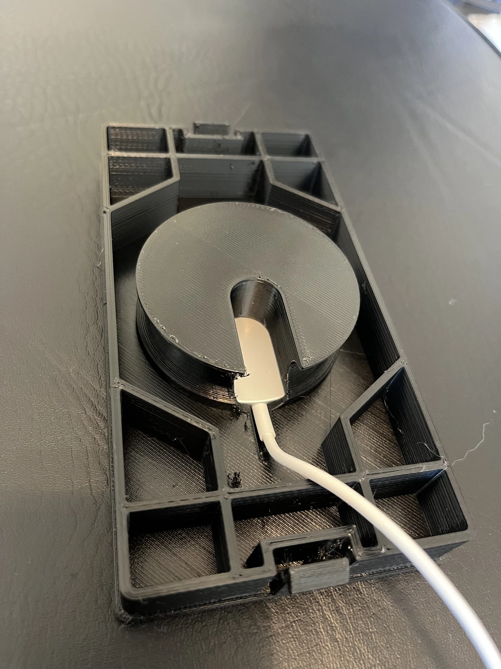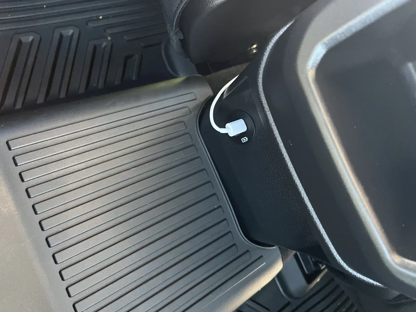 Mình dùng sạc Magsafe loại dây 1m, luồn dây xuống dưới bệ tì tay và đi ra phía dưới bên ghế lái. Độ dài này vừa đủ để cắm vào cổng USB-C cho hàng ghế sau ở cuối bệ tì tay, giúp giấu dây rất gọn. Nếu bạn dùng loại dây 2m, mình có thiết kế sẵn một cái rãnh ở mặt dưới để cuộn phần dây thừa lại.