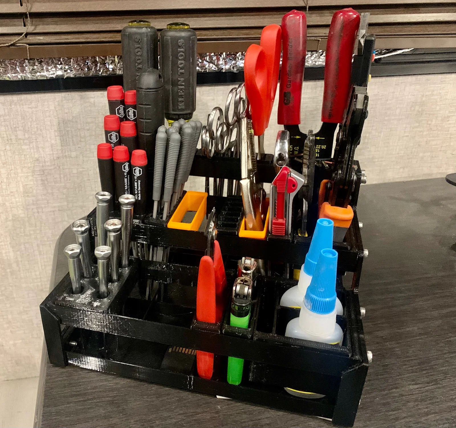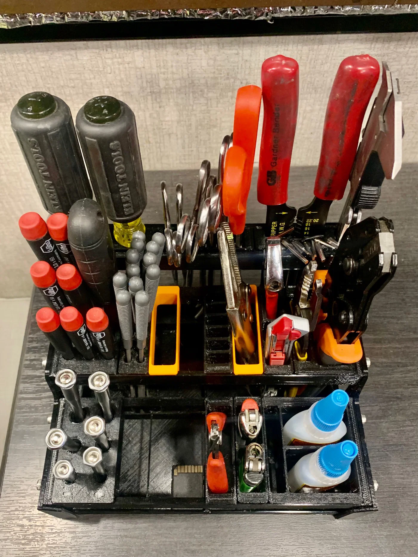 Đây là hệ thống kệ đựng dụng cụ để bàn in 3D hoàn toàn theo dạng module. Mình đã sắp xếp gọn gàng hơn 60 món cầm tay chỉ trong một diện tích 7"x9" (khoảng 18x23cm) mà vẫn còn dư chỗ để thêm đồ nữa.