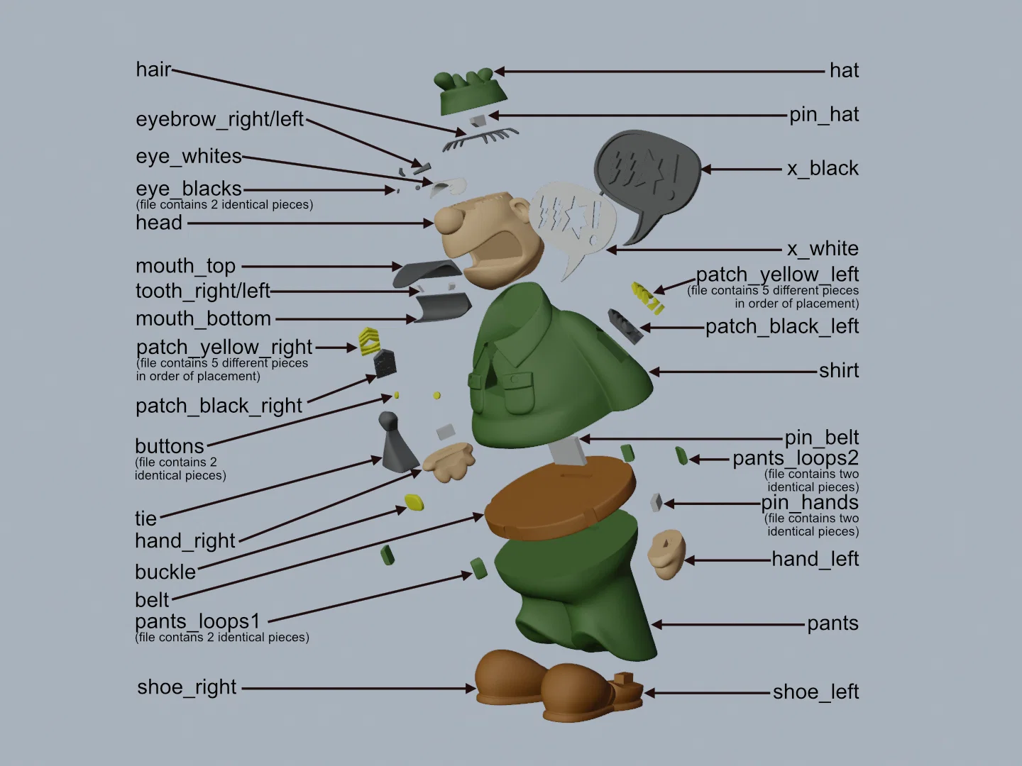 Sergeant Snorkel, từ Beetle Bailey, một bộ truyện tranh Mỹ được tạo ra bởi họa sĩ Mort Walker. Sergeant Snorkel là trung sĩ chỉ huy và cũng là đối thủ của Beetle Bailey. Sarge nổi tiếng vì thường xuyên đánh đập Beetle với đủ mọi lý do, khiến cậu ta tơi tả. Sarge có tính cách thất thường, lúc thì nóng nảy lúc lại đa cảm, nhưng họ lại có một mối quan hệ đồng minh hài hước. Bạn sẽ cần thêm một ít support ở phần tai của đầu mô hình. Nếu có sẵn các loại nhựa (filament) đúng màu thì không cần phải sơn. Mô hình sau khi lắp ráp cao 225mm. Lưu ý: Các mô hình Beetle Bailey và Sergeant Snorkel được đăng tải với kích thước lớn vì có nhiều chi tiết nhỏ. Tôi đã in thử cả hai mô hình này ở tỉ lệ 60% (cao 155mm) và mọi thứ đều ổn, chỉ cần chú ý ở phần patch_black_left/right, vấn đề này đã được giải quyết bằng cách dùng tính năng Arachne perimeter trên máy in. Hãy xem phần hình ảnh để tham khảo cả hai kích thước. Chúc bạn in vui vẻ! ........................................................................................................... Đặc biệt cảm ơn maker Benoît Lussier đã hỗ trợ in kiểm tra (QA) và đóng góp phản hồi chất lượng. ........................................................................................................... Hướng dẫn in: Supports: CÓ cho một bộ phận, xem hướng dẫn chi tiết bên dưới. Rafts: không. Độ phân giải: .2mm. Infill: 15%. Lưu ý: Xem hướng dẫn in và lắp ráp bên dưới. ........................................................................................................... Lắp ráp mô hình Màu sắc: Đen (Devil Designs PLA - Black) cho tóc, x_black, patch_black_right/left, tie, mouth_bottom/top, eye_blacks, eyebrow_right/left. Trắng (Devil Designs PLA - White) cho x_white, eye_whites, tooth_right/left. Xanh lá (BambuLabs PLA - Dark Green) cho shirt, pants, pants_loops1/2, hat. Da (Paramount3D PLA - Universal Beige) cho head, hand_right/left. Nâu (BambuLabs PLA - Brown) cho belt, shoe_right/left. Vàng/Vàng kim (Hatchbox PLA - Gold) cho buttons, buckle, patch_yellow_left/right. Bất kỳ màu nào cho các linh kiện ẩn như pin_belt, pin_hands, pin_hat. ........................................................................................................... Mẹo in và lắp ráp Mẹo in: 1 - Cần dùng support cho một bộ phận. Tôi dùng organic/tree support với góc 29 độ cho phần đầu (chỉ cần ở phần tai). 2 - Một số chi tiết có thể cần thêm brim hoặc raft tùy ý bạn. Tôi thường cẩn thận để tránh lỗi in, nhất là khi chân đế bị che khuất. 4 - Khi tháo mô hình, hãy để riêng các chi tiết trái/phải vào hộp để tránh nhầm lẫn. Mẹo lắp ráp: 1 - Hãy thư thả khi dán keo, nên dán từng nhóm chi tiết trước rồi mới ráp các nhóm lại với nhau. 2 - Tôi dùng keo 3D Gloop (khô nhanh) và E6000 (khô chậm). Nên dùng một lượng nhỏ thôi. 3 - Quan trọng: luôn ướm thử (dry fit) trước khi dán. 4 - Khi ráp đầu/mũ, hãy dán mắt trắng vào đầu trước, rồi đến mắt đen, sau đó mới dán mũ/tóc. Lông mày nên dán sau cùng. 5 - Tham khảo sơ đồ lắp ráp trong phần hình ảnh.