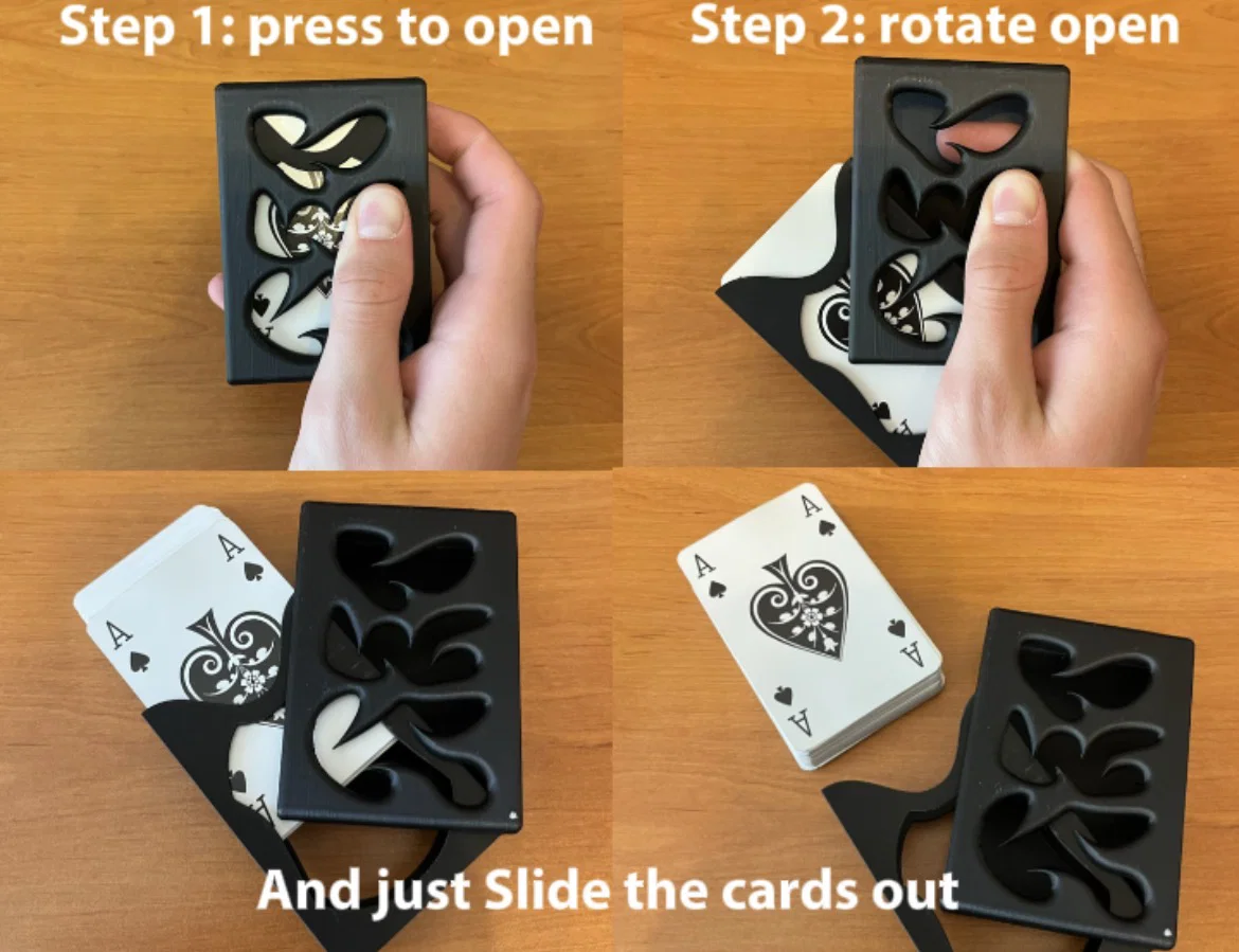 Hộp đựng bài xoay (Rotating Card Case) được in 3D này là cách gọn gàng, tinh tế để mang theo và bảo vệ một bộ bài tiêu chuẩn. Với thiết kế lõi xoay độc đáo, hộp mở ra một cách mượt mà để lấy bài chỉ bằng một thao tác nhanh—không sợ mất nắp, không có chi tiết rời. Chỉ cần xoay, trượt là bạn sẵn sàng nhập cuộc.