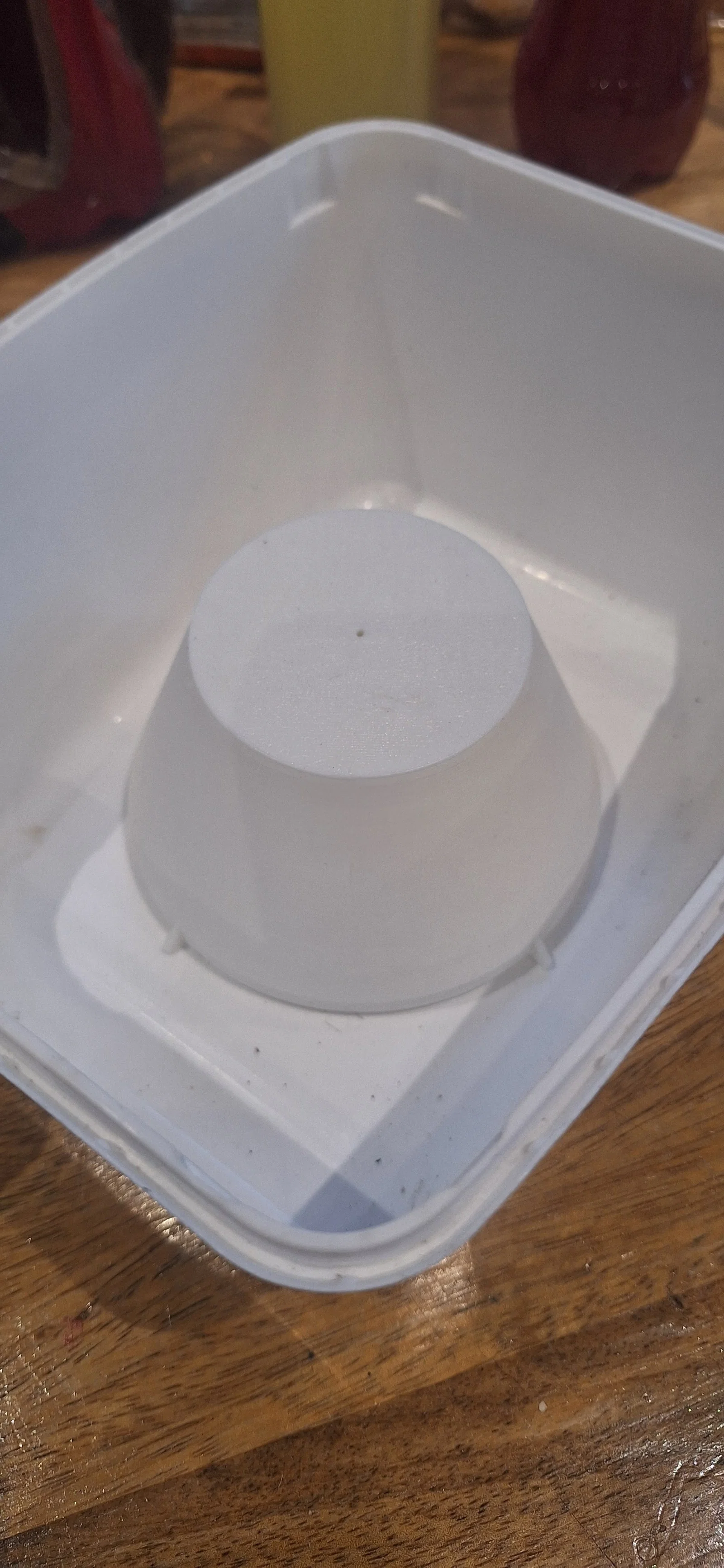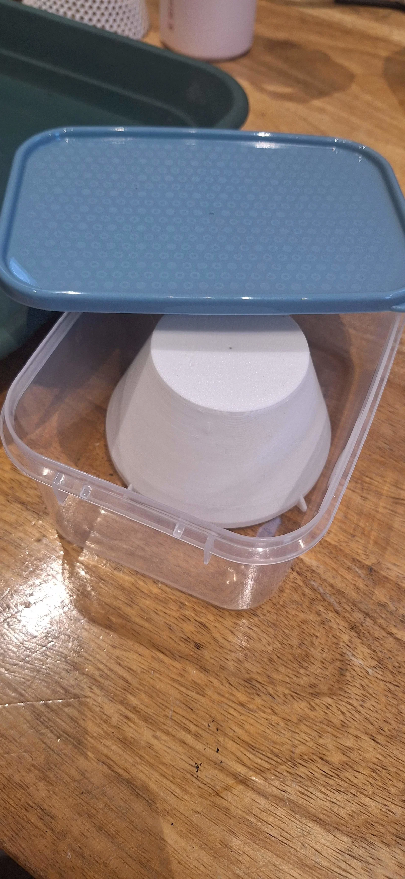 Điều tôi muốn là in một mẫu giá rẻ/nhanh chóng để có thể dùng keo silicon dán vào bất kỳ loại vật dụng chứa đựng nào có sẵn... như hộp kem, chậu rửa bát, khay ươm hạt, v.v. Điều này cũng giúp bạn tùy ý chọn dung tích thùng chứa theo nhu cầu. Tôi thường đặt các thùng chứa này vào trong một thùng nuôi (super/brood box) trống nên không cần dùng nắp đậy.