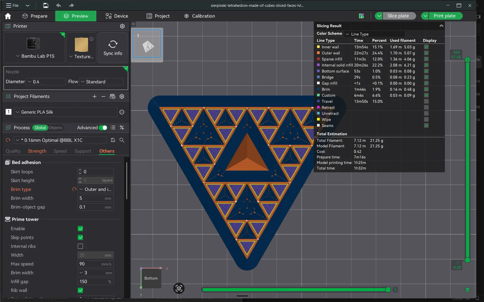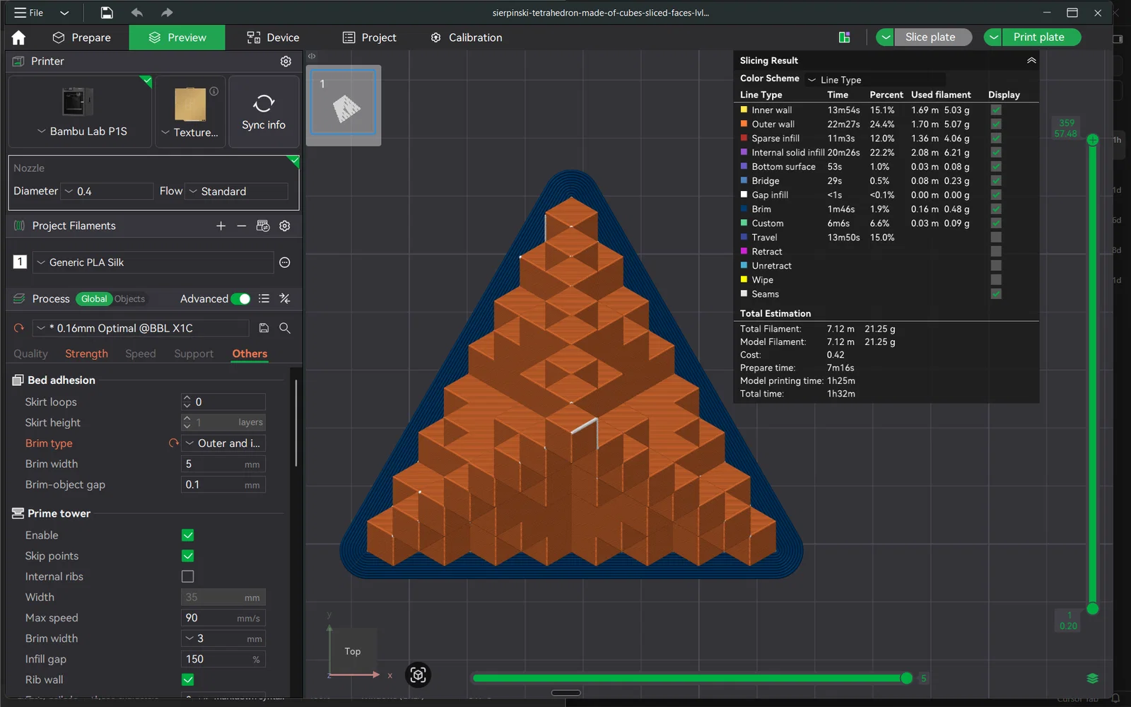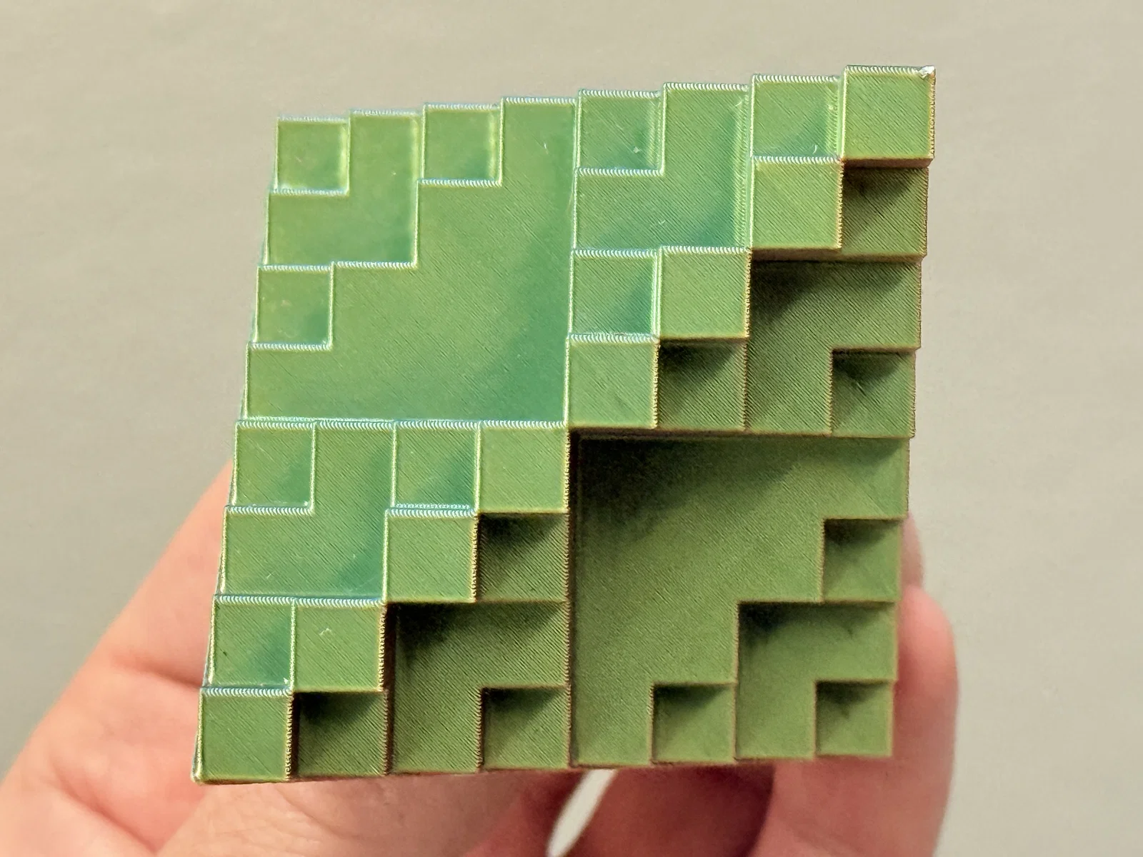 Mình khuyên mọi người nên in mẫu này bằng nhựa tri-color silk PLA giống như loại filament trong hình. Màu sắc chuyển đổi sẽ làm nổi bật các lớp bậc thang của những khối lập phương, tạo thêm chiều sâu cho thiết kế đệ quy này.