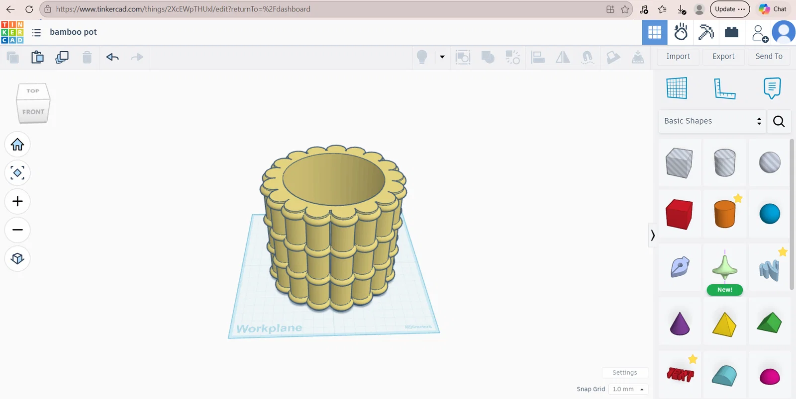 Sản phẩm này được tạo ra hoàn toàn từ đầu trên phần mềm Tinkercad, mang lại vẻ ngoài cứng cáp nhưng vẫn rất mềm mại nhờ các đường cong uốn lượn xung quanh thân chậu. Chậu có cấu trúc vững chãi, rất phù hợp để đặt trên bàn làm việc, kệ sách hoặc cửa sổ để trồng những loại cây nhỏ như sen đá, xương rồng hoặc các loại cây kiểng văn phòng khác. Màu sắc của sản phẩm sau khi in ra sẽ phụ thuộc hoàn toàn vào loại nhựa mà bạn lựa chọn, tuy nhiên, sử dụng nhựa màu xanh lá hoặc màu gỗ sẽ giúp làm nổi bật họa tiết tre trúc vốn có của thiết kế này.