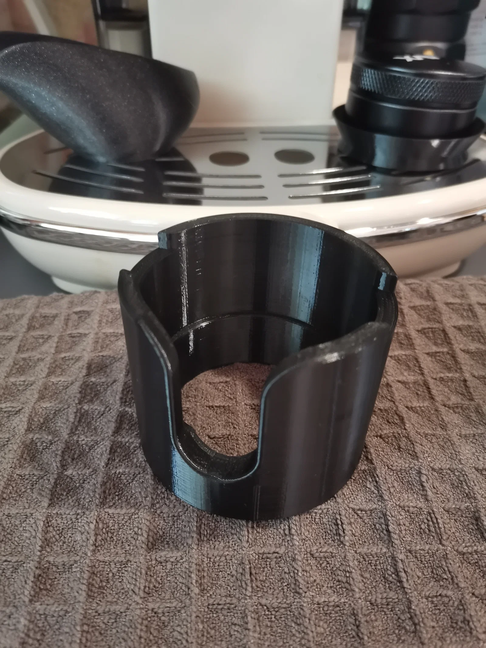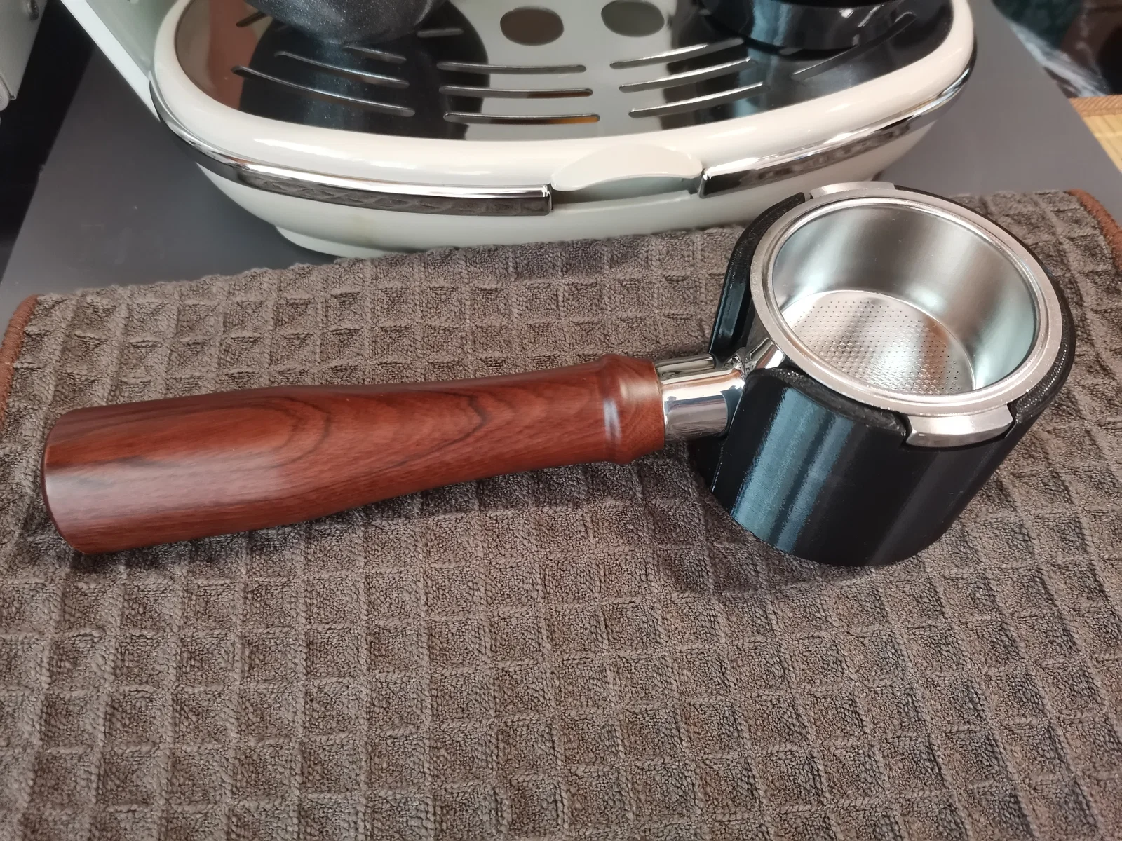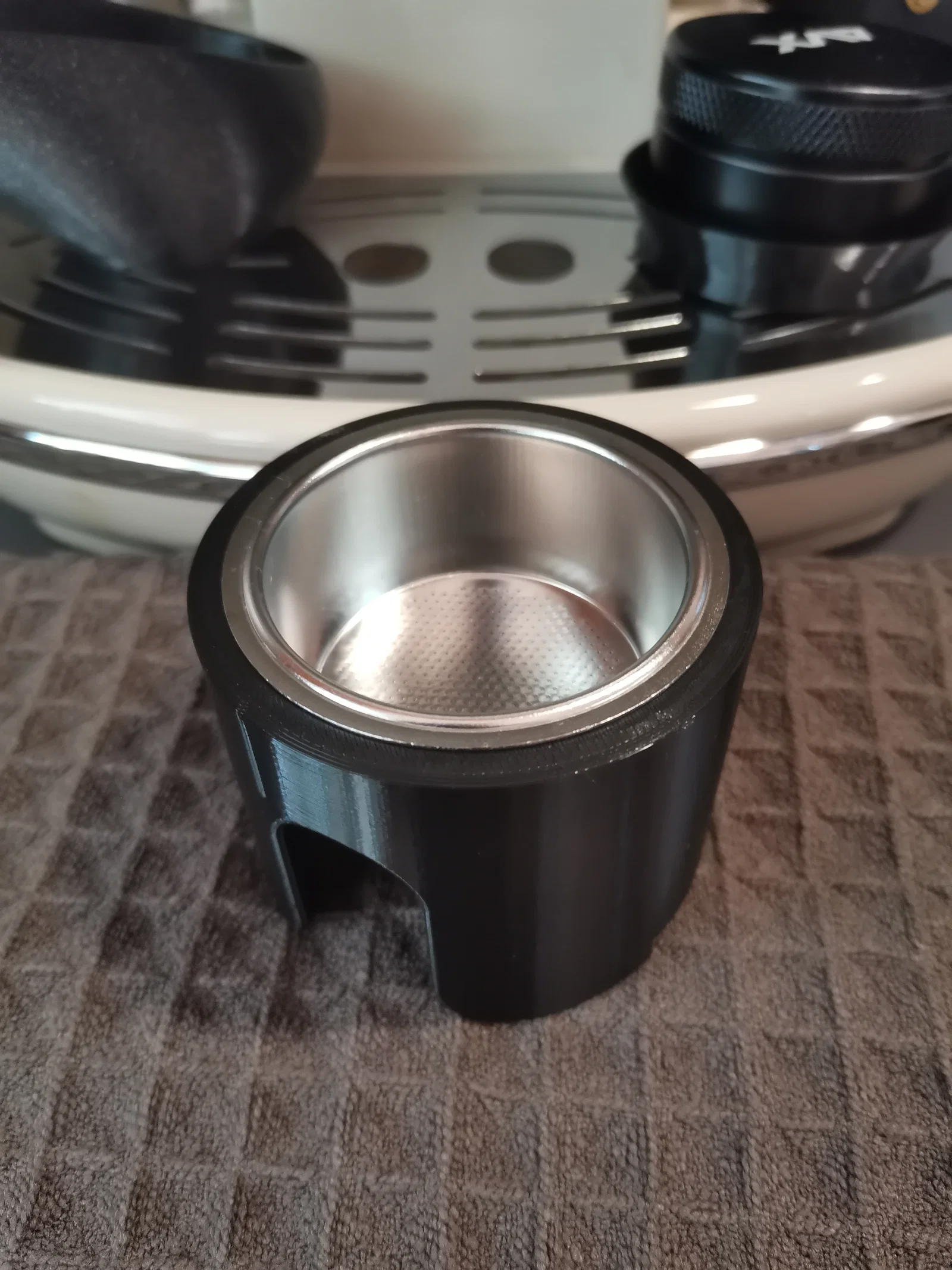 Trạm nén cà phê (tamping station) này cũng có thể dùng úp ngược lại để chuẩn bị nén cà phê trong giỏ lọc (filter basket) 51mm.