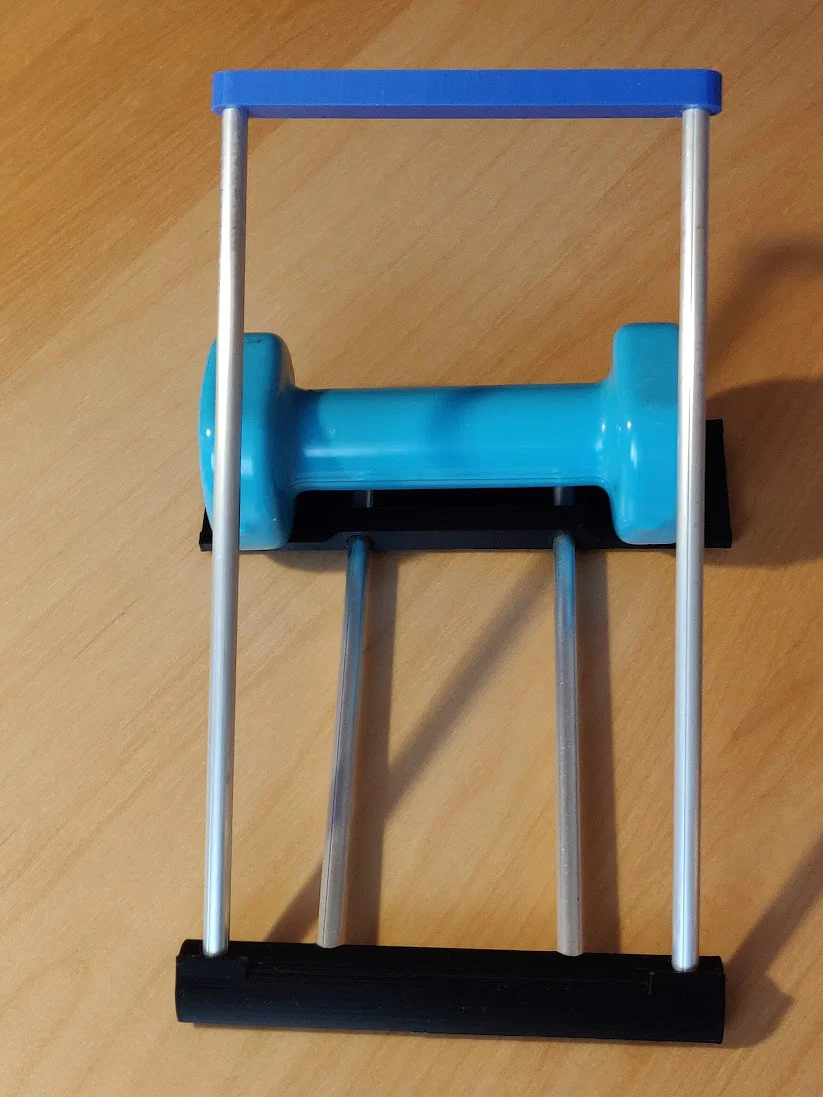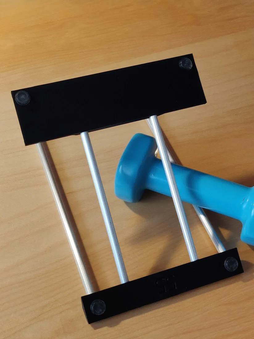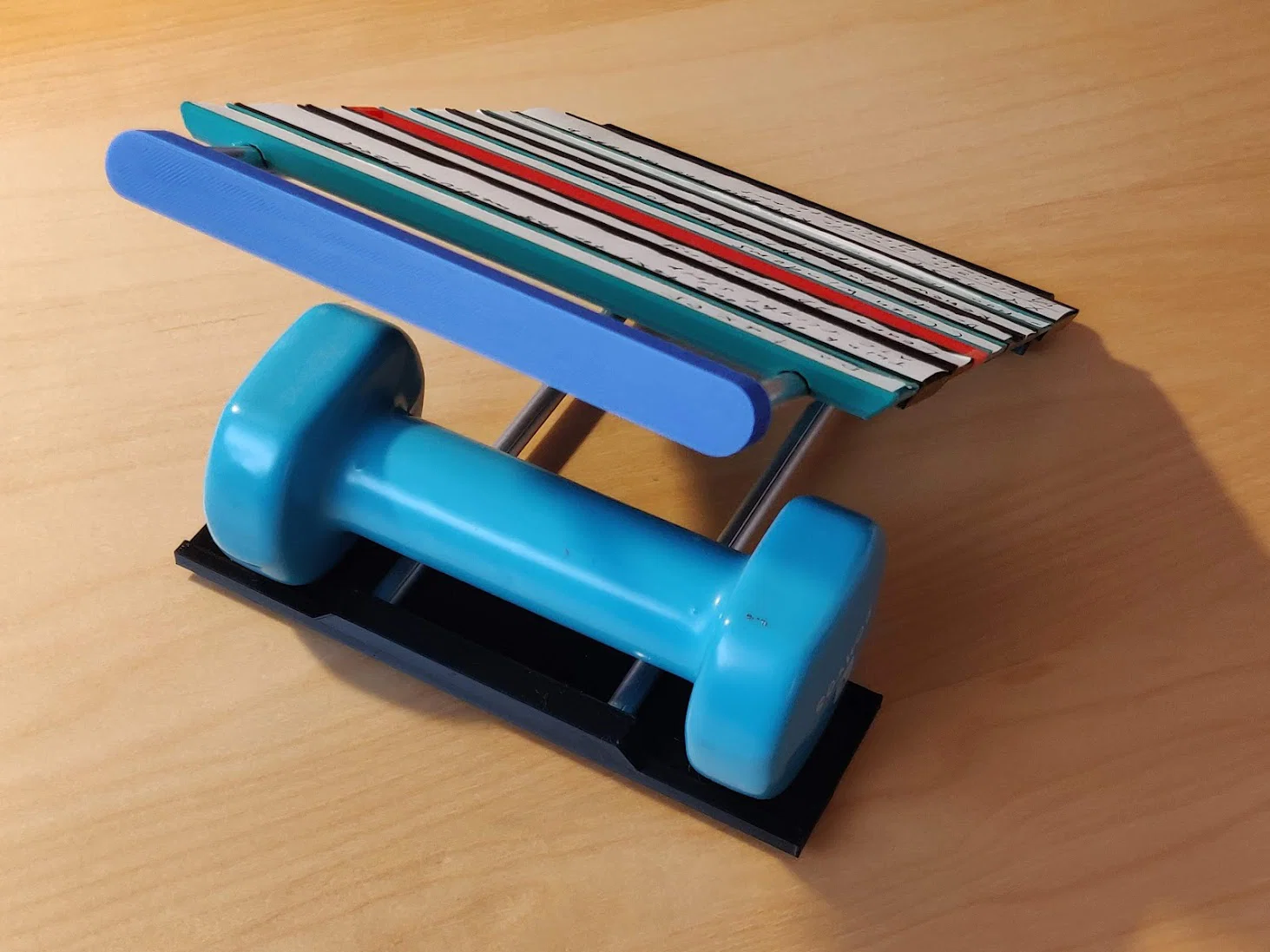 Để kết nối phần trước và sau, bạn cần hai thanh dài khoảng 15 cm; đối với thanh giữ giấy thực tế, hãy cắt hai thanh dài 20-25 cm. Dán hai miếng đệm cao su dưới phần đế trước và hai miếng dưới phần đế sau. Việc này giúp quả tạ tạo lực ép nhiều hơn lên phần đế trước. Cuối cùng, đặt quả tạ lên phần đế sau để giữ cho giá đỡ đứng vững.