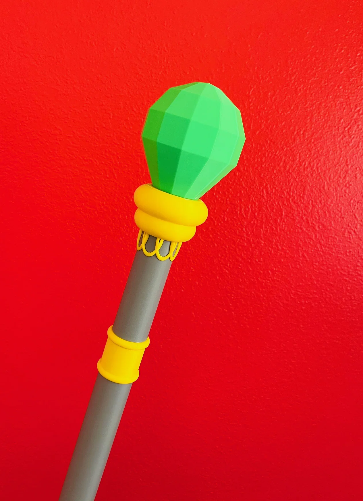 Việc lắp ráp khá đơn giản và dễ hiểu sau khi bạn đã in xong toàn bộ các mảnh. Hãy bắt đầu từ phần thân dưới, chèn thanh chốt vào và dán keo. Lần lượt lắp mảnh trung gian, mảnh nối, rồi đến mảnh trên cùng. Nhớ chèn thanh chốt và dán keo xuyên suốt quá trình này. Đây là cách hoàn thiện thân trượng. Mình khuyên bạn nên dán viên ngọc vào khung trước cho thật khô, rồi mới dán toàn bộ khung và ngọc vào thân trượng.