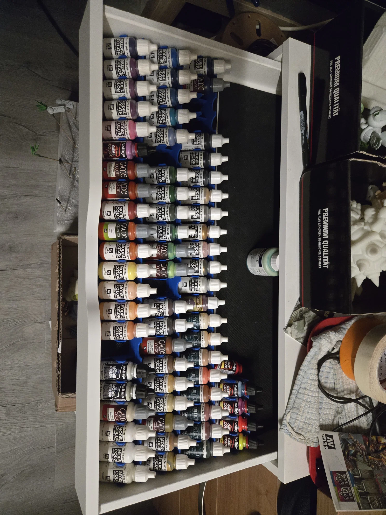 Giải pháp in 3D nhanh chóng và tiết kiệm để sắp xếp các lọ sơn Vallejo gọn gàng trong ngăn kéo tủ Alex của bạn. Thiết kế giúp trưng bày sơn ở góc nghiêng, thuận tiện quan sát màu sắc và tên nhãn hiệu.