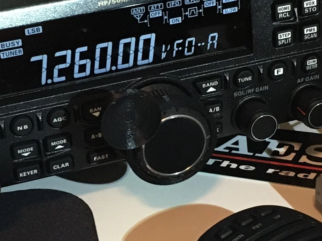 Đây là một miếng đệm kẹp vào núm xoay điều chỉnh tần số (tuning dial) cho máy bộ đàm Yaesu FT-450D. Mình thiết kế nó trong đợt ARRL Phone Sweepstakes năm 2020 để giúp việc dò tần số thuận tiện hơn. Phụ kiện này sẽ vừa với các loại núm xoay có đường kính 35mm.
