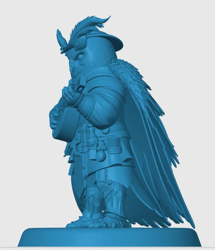 Mô hình Owlin Bard chi tiết dành cho các game nhập vai RPG. Thiết kế tinh xảo nên ưu tiên in nhựa (resin). Nếu dùng in filament, bạn hãy chú ý giảm tốc độ và dùng nozzle nhỏ để đạt chất lượng in tốt nhất.