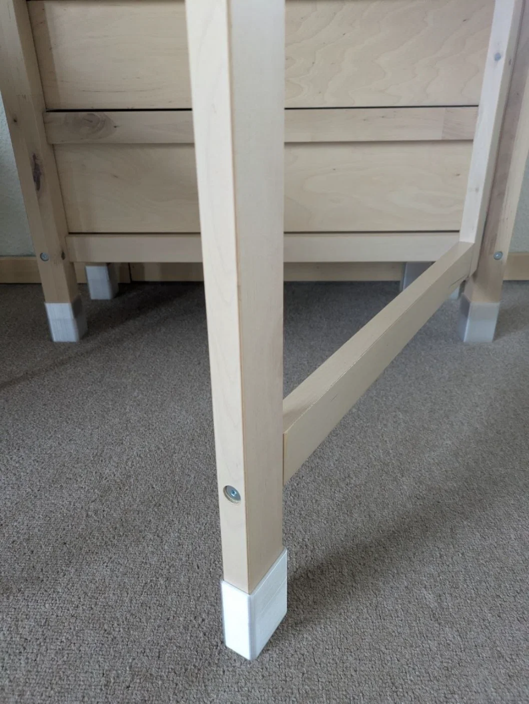 Mình đã dùng keo dán các chân đế này vào, nhưng vẫn tận dụng các lỗ bắt vít để tăng thêm độ chắc chắn nhờ vào các thành vách bổ sung. Các file STL được cung cấp sẵn giúp nâng chiều cao mặt bàn từ 74cm lên 79cm.