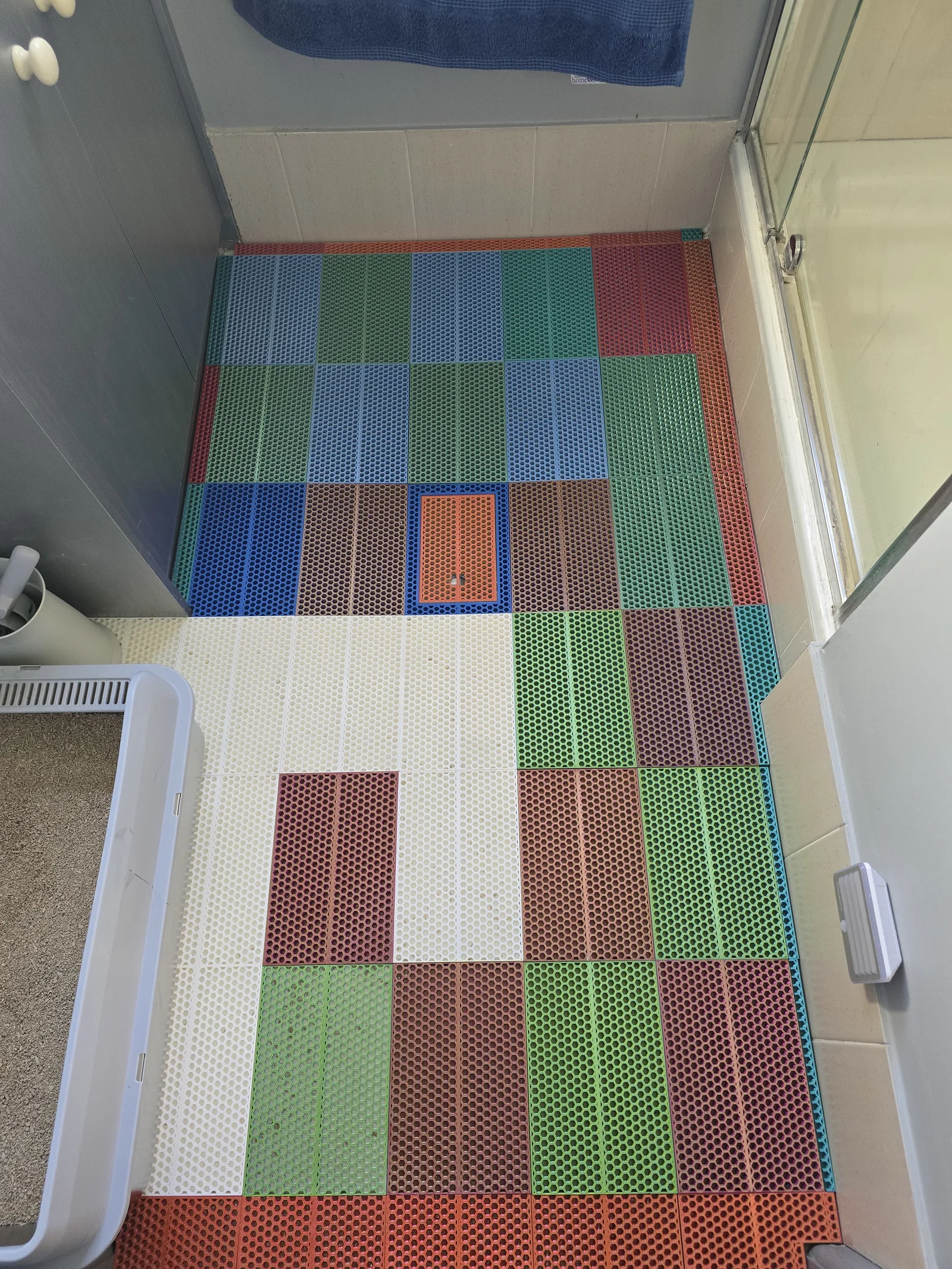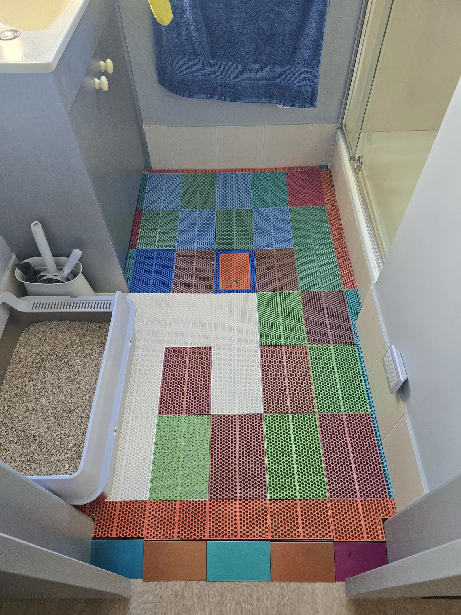 Mẫu tấm lót sàn tiện lợi giúp ngăn văng cát vệ sinh cho mèo. Thiết kế bao gồm cả tấm tiêu chuẩn và tấm có thể tháo rời để thoát nước, dễ dàng lắp đặt bằng băng keo hai mặt với kích thước chi tiết cho từng loại.