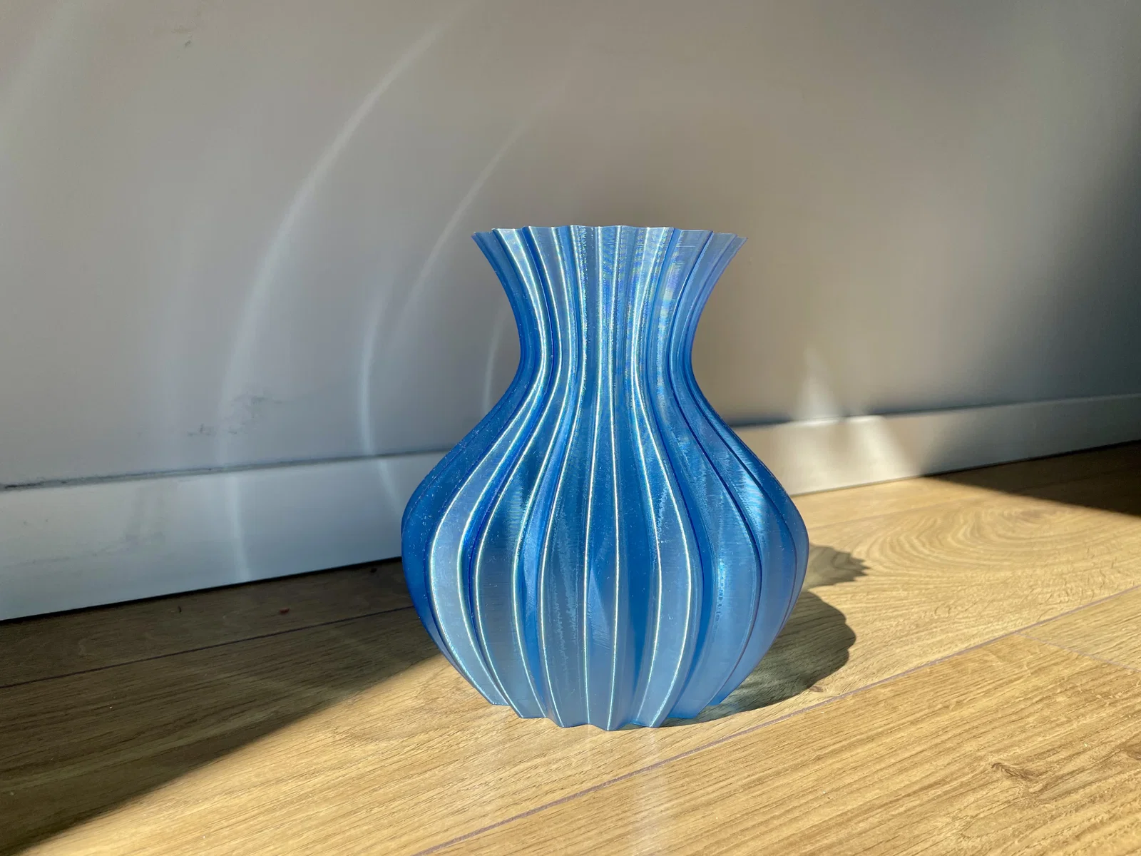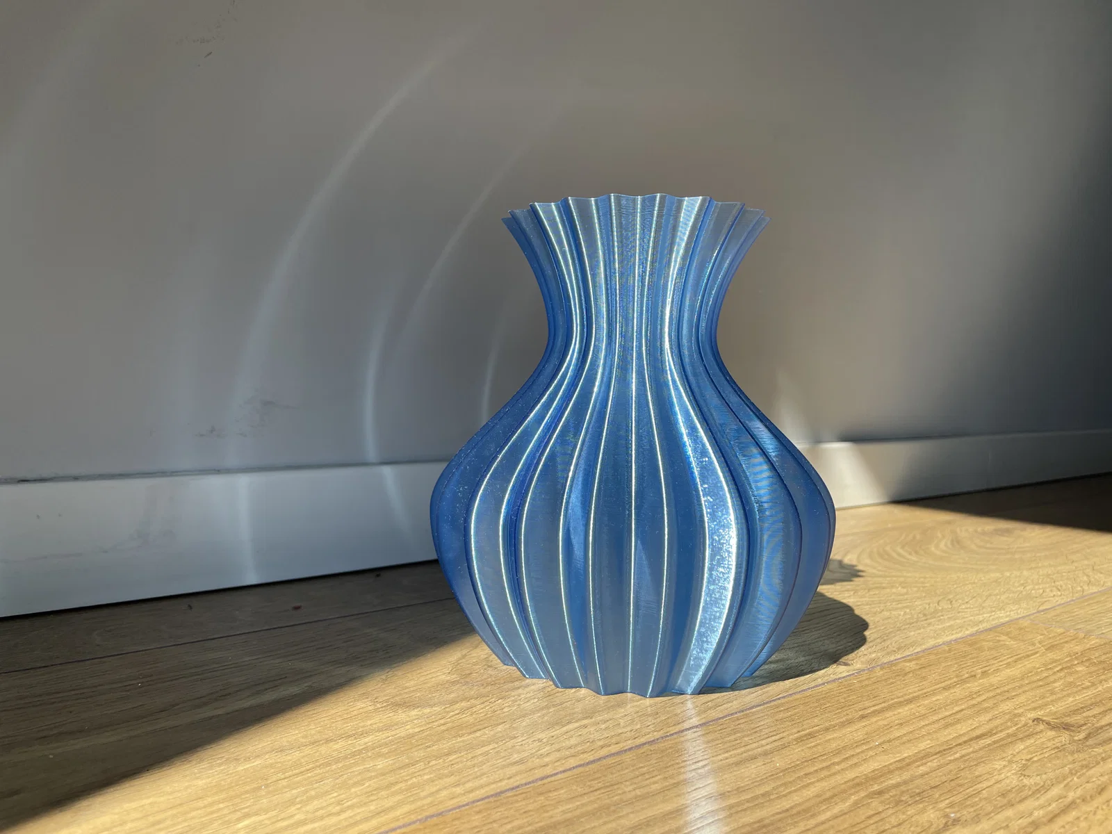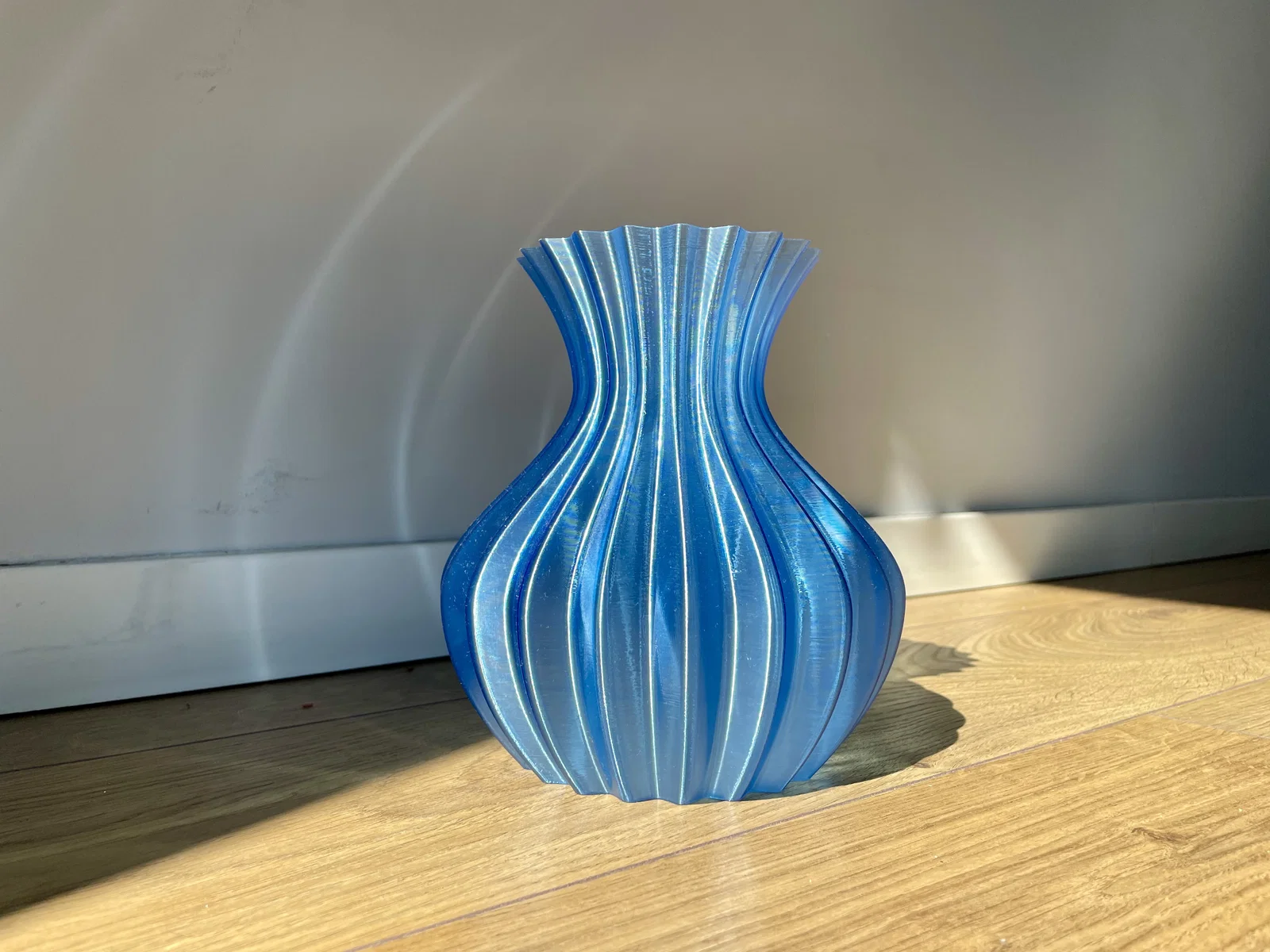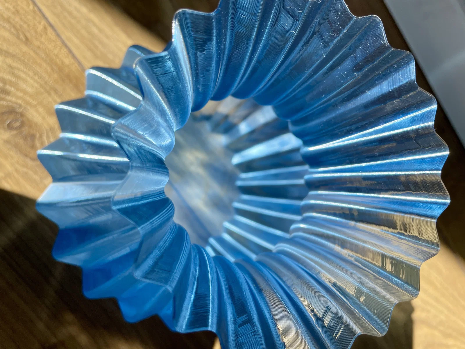 Chiếc bình hoa họa tiết trong suốt màu xanh dương này mang vẻ ngoài tinh tế như thủy tinh. Thiết kế tối ưu để in với đầu phun 0.8mm, giúp bạn tạo ra thành phẩm sáng bóng, đẹp mắt như những khối băng nếu thực hiện đúng kỹ thuật in và sấy nhựa.
