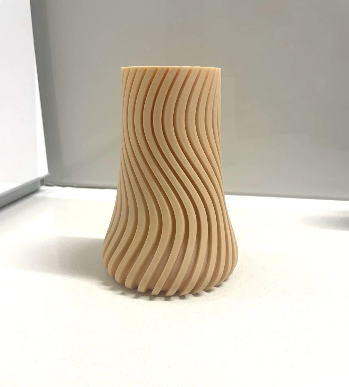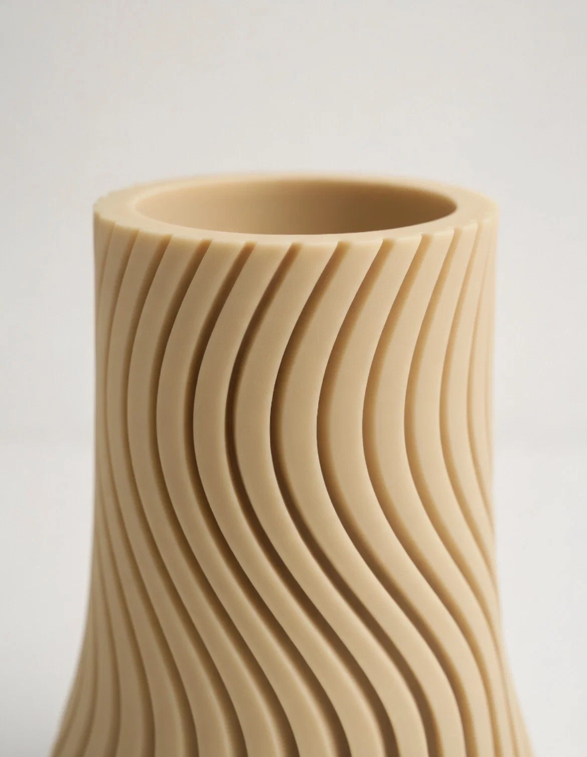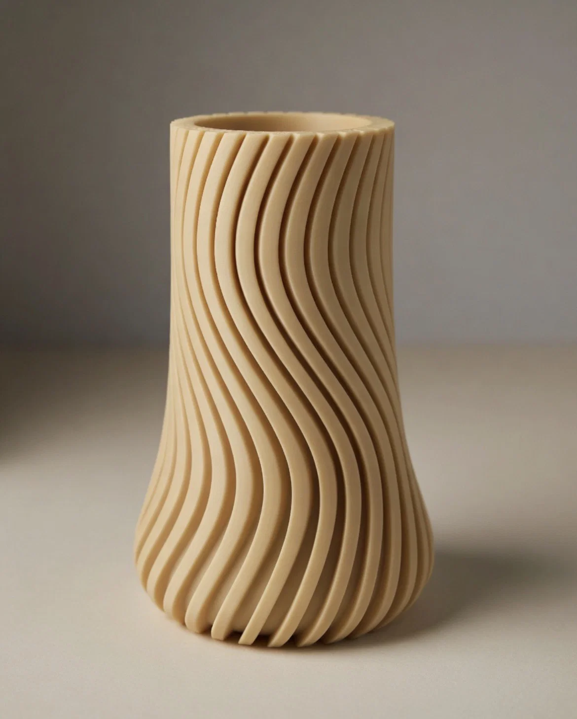 Mẫu bình hoa này sở hữu thiết kế hiện đại, tinh tế với những đường cong mềm mại bao quanh thân bình theo dạng xoắn ốc đầy nghệ thuật. Bề mặt bình được tạo hình bằng các gờ sóng đều đặn, tạo nên chiều sâu và cảm giác chuyển động sống động. Hình dáng bình hơi thon lại ở phần giữa và mở rộng dần về phía đế, mang đến một vẻ ngoài cân đối và phong cách. Tông màu be nhẹ nhàng tạo cảm giác ấm cúng, tối giản, cực kỳ phù hợp cho không gian nội thất hiện đại. Thiết kế bề mặt vân nổi còn giúp bắt sáng và tạo đổ bóng rất đẹp, tôn lên vẻ điêu khắc độc đáo của chiếc bình.