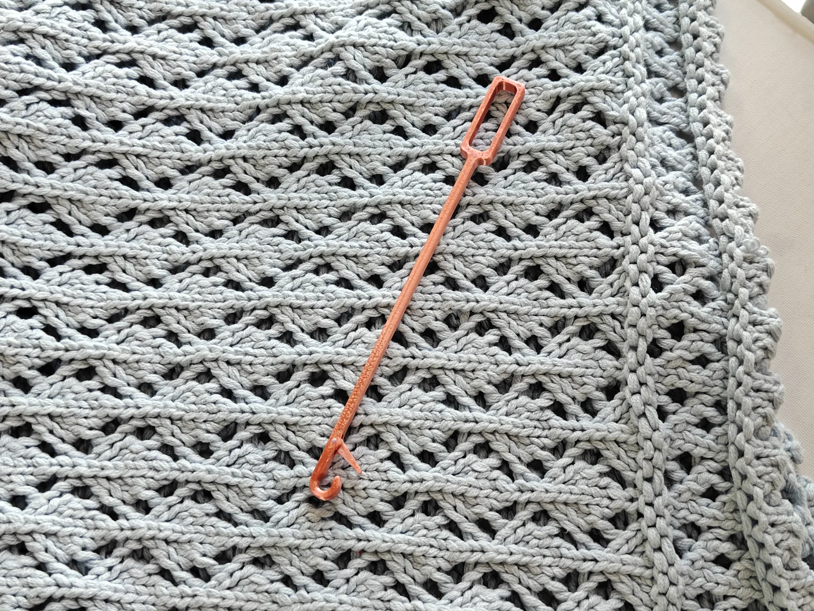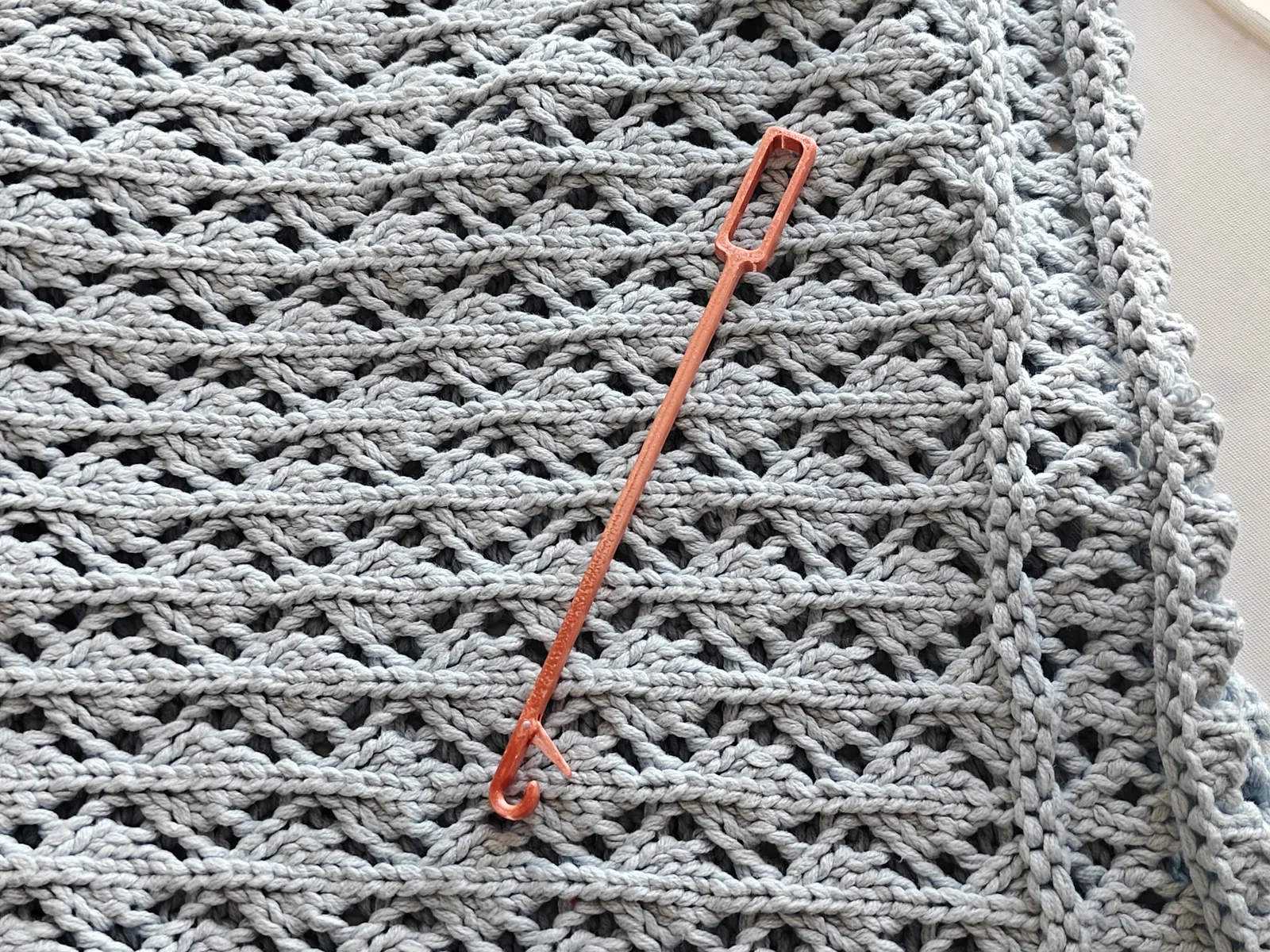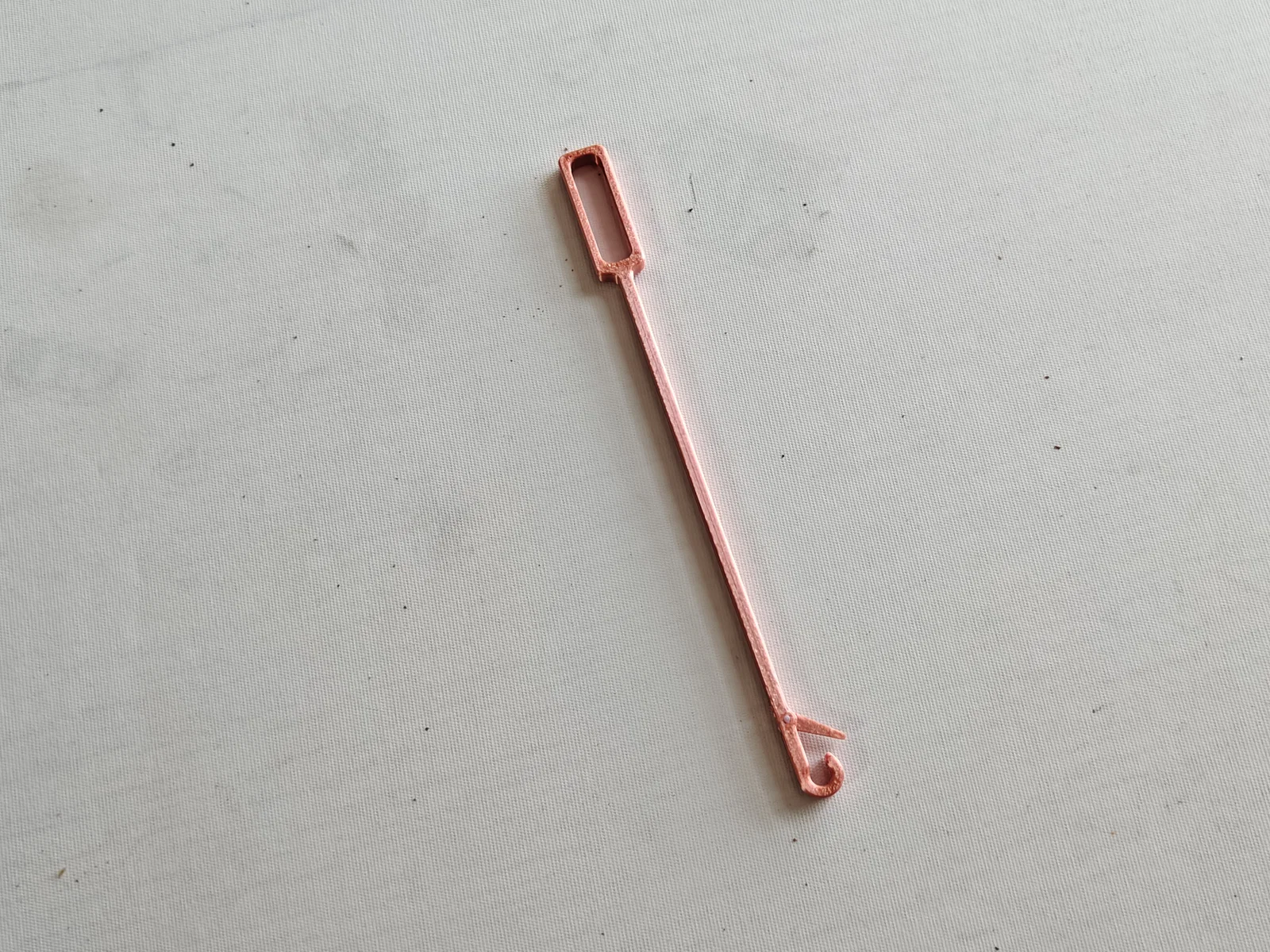 Mẫu thiết kế này có bộ phận móc chặn ngược, giúp ngăn tình trạng kim bị vướng vào các mũi đan đã hoàn thiện khi di chuyển. Vì vậy, bạn cần lắp ráp đơn giản sau khi in xong. Sau khi loại bỏ các cấu trúc hỗ trợ (support), hãy gắn linh kiện nhỏ vào thân chính của kim móc. Bạn sẽ cần dùng một đoạn sợi nhựa (filament). Hãy hơ nóng và kéo dãn sợi nhựa cho mảnh lại, sau đó dùng nó làm trục xuyên qua tâm của linh kiện. Để chừa lại một đoạn nhỏ ở hai đầu, dùng bật lửa hơ nóng rồi ép dẹt để cố định chắc chắn, đảm bảo sử dụng ổn định.