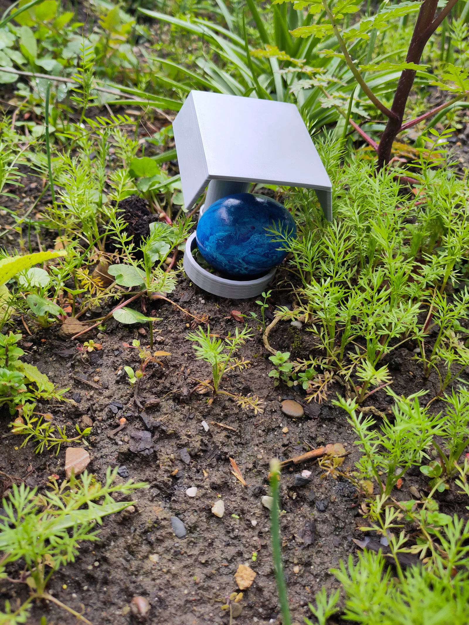Sản phẩm được thiết kế với hình dáng thông minh, bao gồm một phần đế tròn cố định quả trứng và một mái che nhô ra phía trên. Cấu trúc này không chỉ giúp che chắn nước mưa rơi trực tiếp vào quả trứng mà còn tạo điểm nhấn trang trí độc đáo trong không gian sân vườn nhà bạn. Bạn chỉ cần in 3D mô hình này, đặt quả trứng vào phần đế, và bạn đã sẵn sàng cho một buổi săn trứng Phục sinh đầy thú vị mà không lo ngại về vấn đề thời tiết.