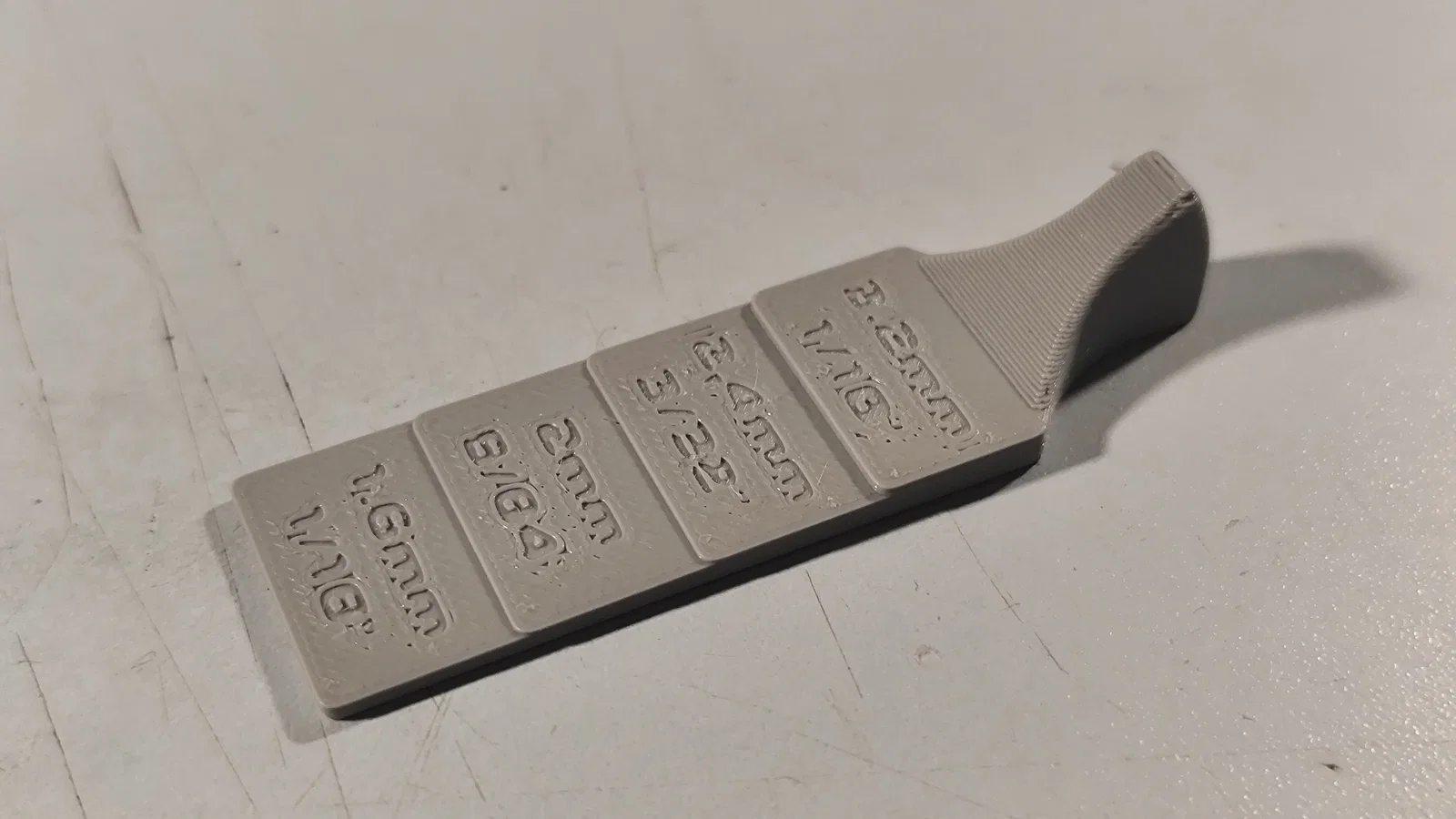 Thước hỗ trợ các mức độ cao: 1.6mm (1/16"), 2mm (5/64"), 2.4mm (3/32") và 3.2mm (1/18"). Các thông số này được khắc trực tiếp lên thước, bạn có thể dùng bút đi nét (fineliner) tô lên các vạch số để dễ nhìn hơn. Lưu ý là các con số hệ inch chỉ mang tính chất tham khảo thôi nha.