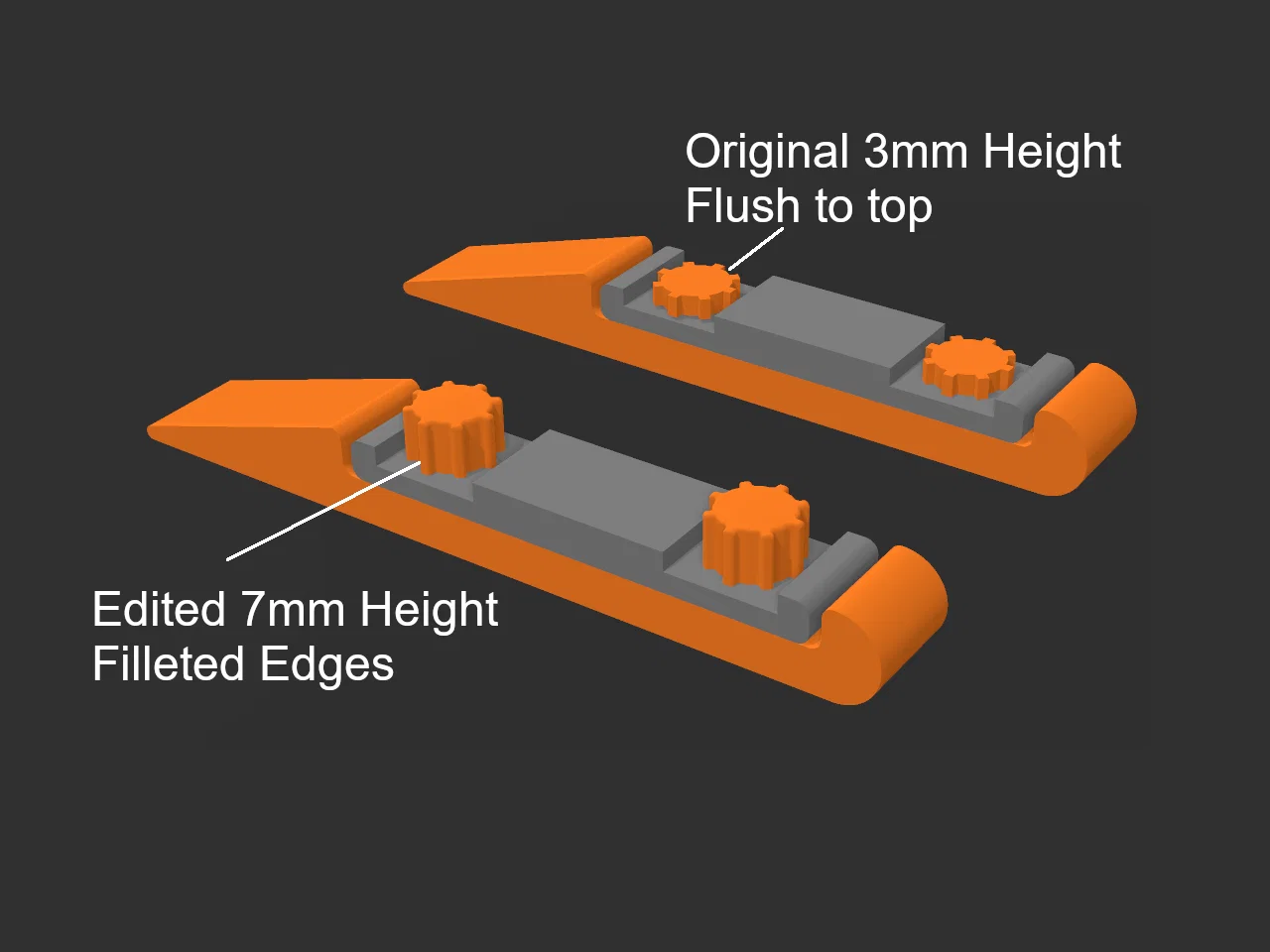 Mình đã tăng chiều cao của phần núm vặn từ 3mm lên 7mm và bo tròn các cạnh nhỏ. Thay đổi này giúp mọi người cầm nắm và vặn ốc bằng tay dễ dàng hơn nhiều.