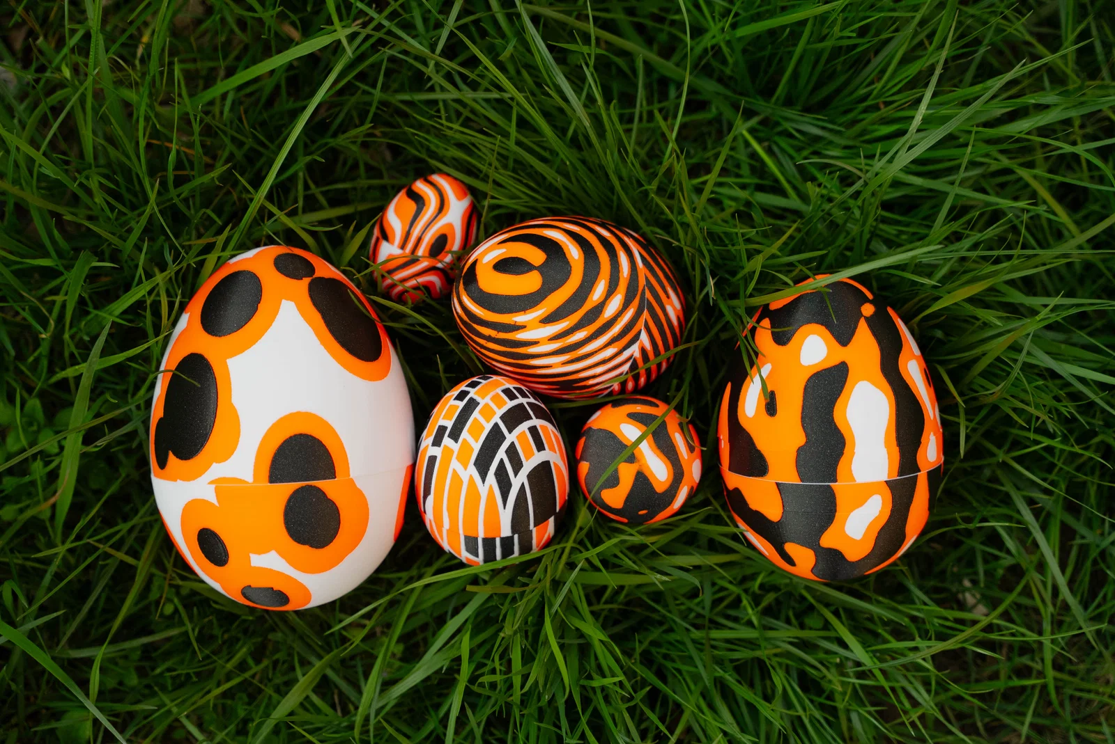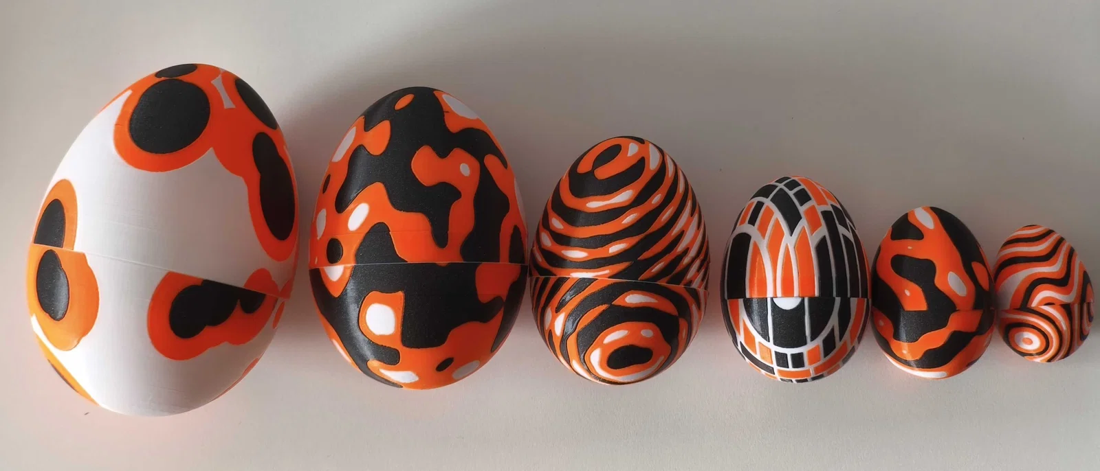 Đây là bản remix đơn giản từ bộ trứng phục sinh xếp chồng của squinn. Tôi đã thêm ba kích cỡ lớn hơn nữa để bạn có thể xếp lồng đến sáu quả trứng vào nhau. Quả trứng lớn nhất cao khoảng 16cm khi lắp hoàn chỉnh. Các file trứng được chia thành bốn tệp: Standard-Large-Jumbo, bao gồm tất cả các bộ phận cho ba quả trứng ban đầu. Jumbo XL, XXL và XXXL là ba quả trứng siêu lớn theo thứ tự kích thước. Hãy xem ảnh chụp tất cả sáu quả trứng trên bàn để thấy hoa văn tương ứng của từng kích cỡ. Mỗi quả trứng có một hoa văn ba màu riêng biệt. Tôi đã sử dụng các shader của Blender để tạo texture theo quy trình, sau đó xuất ra cho PrusaSlicer bằng add-on xuất 3MF. Ngay cả ba quả trứng lớn nhất cũng có thể in mà không cần support, mặc dù bề mặt bên trong sẽ không được hoàn hảo lắm. Đáng tiếc là hoa văn ở nửa dưới và nửa trên không thực sự khớp nhau khi bạn vặn đóng trứng lại - đây là sơ suất của tôi và có lẽ có thể khắc phục nếu chỉnh sửa thêm. Tôi đã in bộ trứng này trên máy Prusa XL, sử dụng nhựa Prusament màu Pristine White, Galaxy Black và Prusa Orange. * Mẫu mô hình này cũng đã xuất hiện trong một Youtube short chính thức của Prusa!