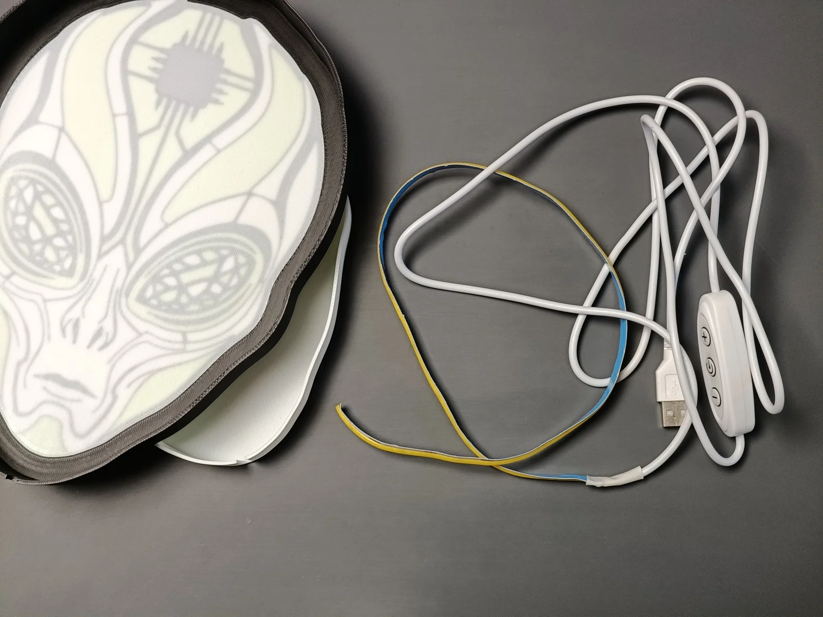 Mình đã sử dụng dải đèn LED giá rẻ này: https://s.click.aliexpress.com/e/_c3DySCUD (loại có 3 nút bấm, màu trắng tự nhiên, dài 0.5m). Đèn này kết nối qua cổng USB máy tính hoặc củ sạc, tiêu thụ tối đa chỉ 500mA nên rất an toàn với hầu hết các cổng USB hiện nay. Dây đèn có 3 nút để bật/tắt và chỉnh độ sáng. Ở ngoài nhìn đèn đẹp hơn trong ảnh mình chụp nhiều. Dải LED này đã có sẵn keo dán, bạn chỉ cần dán nó vào mặt trong của phần đế là xong.