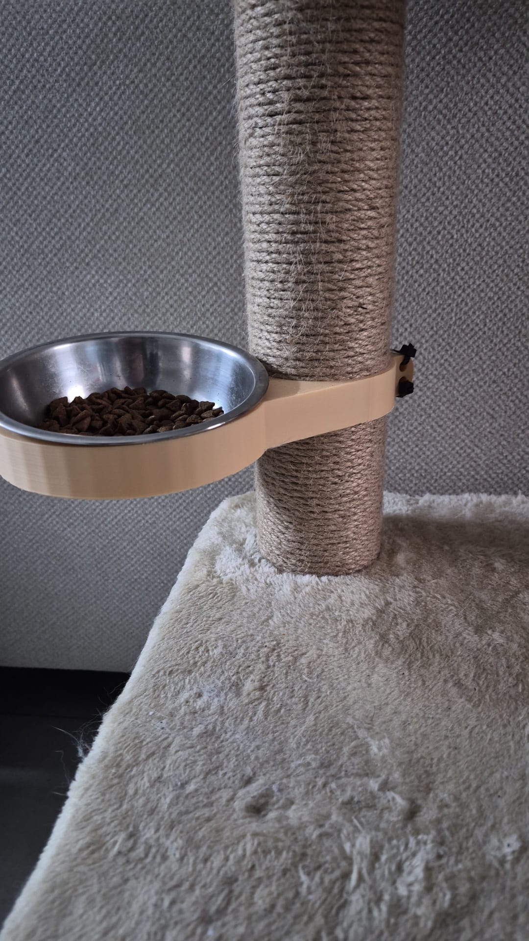 Thiết kế của giá đỡ này cực kỳ thông minh với khả năng ôm sát vào các trụ cào móng hình trụ phổ biến thường thấy trong nhà cây cho mèo. Thay vì phải khoan tường hay tìm chỗ đặt bát, bạn chỉ cần lắp giá đỡ vào vị trí phù hợp trên trụ. Chiếc giá này giữ bát ăn chắc chắn ở một độ cao lý tưởng, giúp mèo không cần cúi quá thấp, từ đó hỗ trợ hệ tiêu hóa và tạo tư thế thoải mái hơn cho thú cưng trong mỗi bữa ăn. Đây thực sự là một giải pháp hữu ích cho những căn hộ có diện tích nhỏ hoặc khi bạn muốn tối ưu hóa không gian cho các bé mèo năng động.