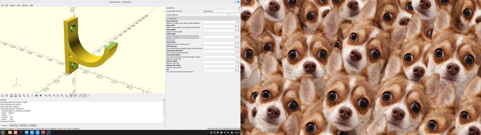 Mẫu móc treo tường dạng tham số được thiết kế bằng OpenSCAD. Bạn có thể dễ dàng thay đổi kích thước cho phù hợp với nhu cầu sử dụng và bắt vít trực tiếp vào bề mặt một cách chắc chắn. File nguồn được đính kèm để mọi người cùng học hỏi và cải tiến.