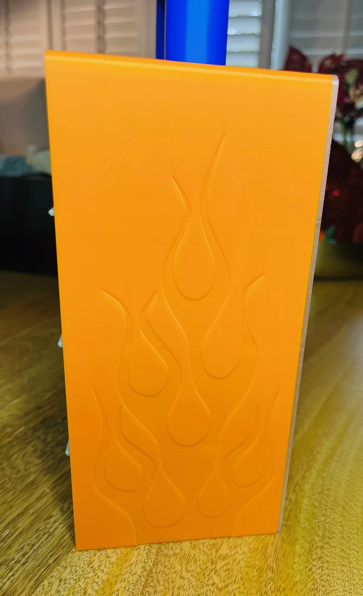 Gara đựng xe đồ chơi này có thiết kế 4x4, cho phép chứa tổng cộng 16 chiếc xe đồ chơi. Phần mặt sau bạn có thể in bằng màu sắc khác, ví dụ như dùng nhựa trong suốt để tạo điểm nhấn. Hai bên hông được trang trí họa tiết ngọn lửa. Phía trên có gắn tay cầm giúp bé dễ dàng mang theo đi chơi. Các ngăn để xe được thiết kế hơi nghiêng vào trong giúp giữ xe chắc chắn, hạn chế việc bị rơi ra ngoài.