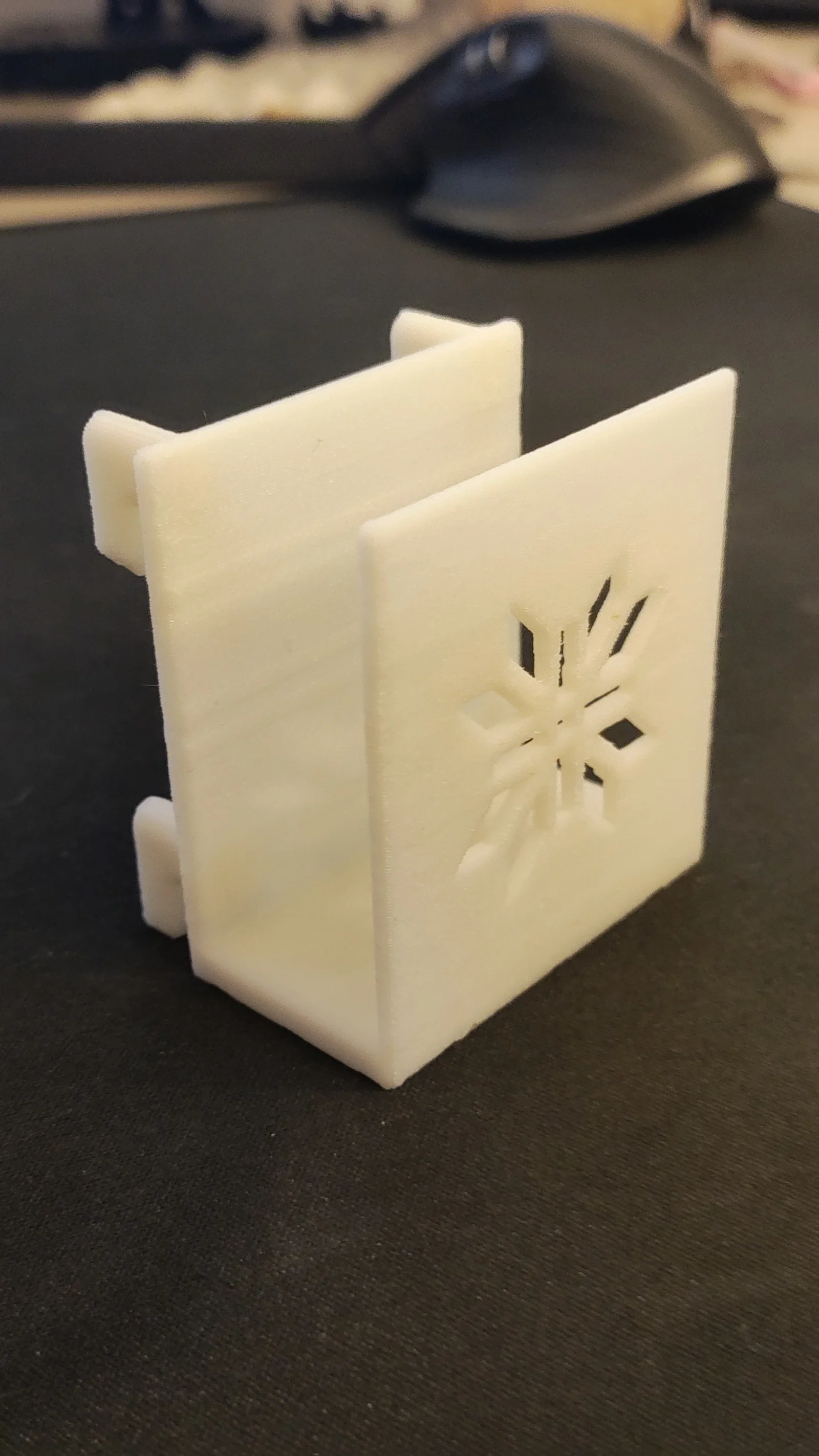Thiết lập: 3 tường (walls), 25% infill tùy ý. In bằng PLA là ổn rồi. Chỉ cần thêm support cho các chốt bên trên theo hướng đặt file. Phần đế có thiết kế dạng lưới giúp in các loại vật liệu dễ bị cong vênh (như ABS/ASA) mà không gặp trở ngại gì. Nếu bạn hay gặp khó khăn khi in PLA bám vào bàn in thì thiết kế này cũng hỗ trợ rất tốt đấy.