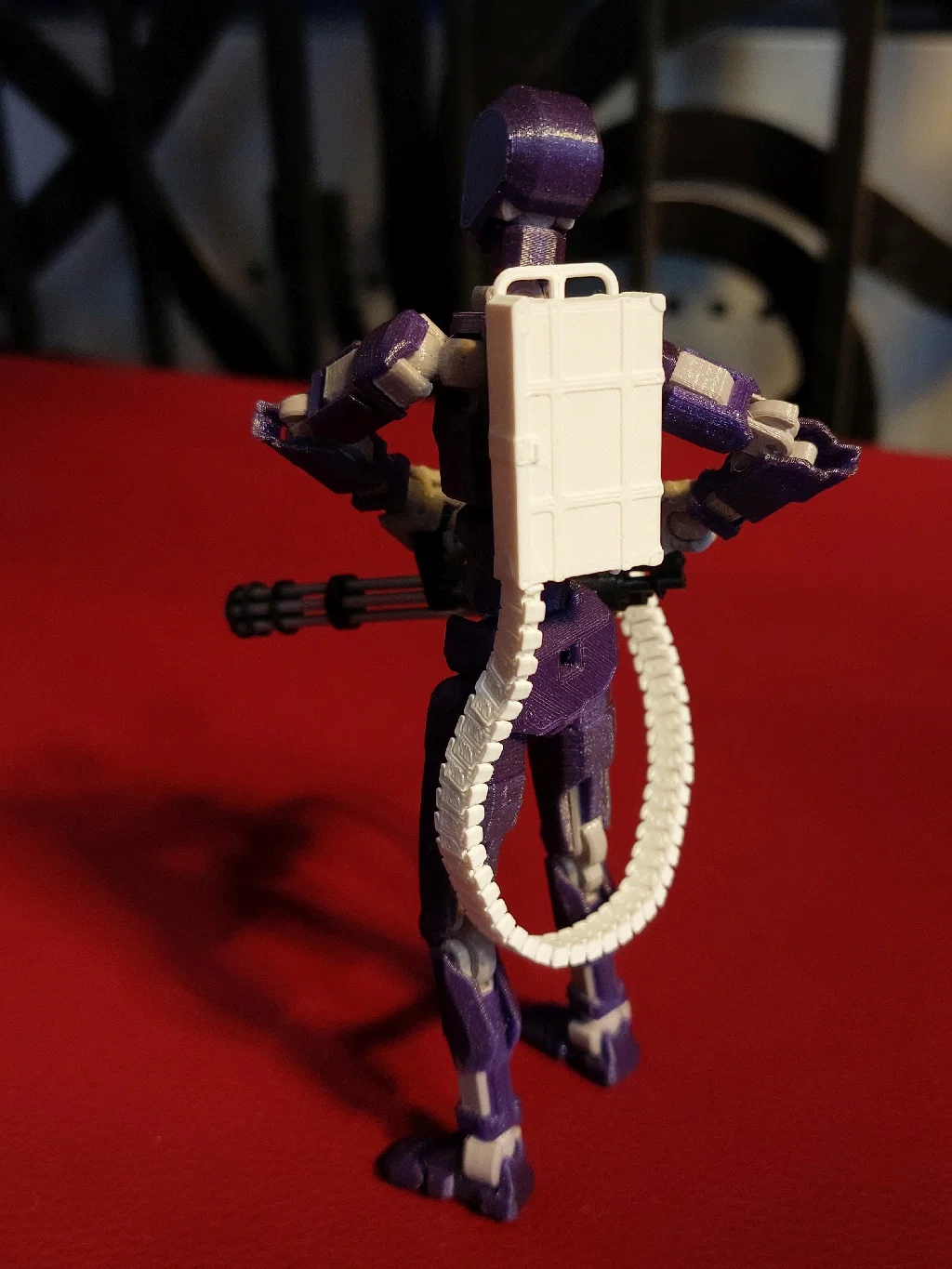 Hộp đạn đeo lưng được thiết kế để đi kèm với mẫu súng minigun cho Dummy 13, có băng tải đạn linh hoạt. Thiết kế lấy cảm hứng từ hộp đạn XM-23 và hệ thống ALICE, rất phù hợp để làm phụ kiện cho mô hình Dummy 13 của bạn.