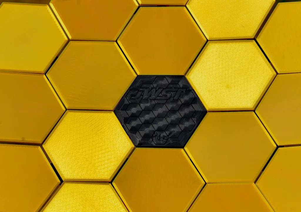 18 Vàng/Vàng đậm (hiệu ứng tốt nhất khi sử dụng bàn kính, và "esun Dark Yellow Silk PLA). 18 viên lục giác này được in: