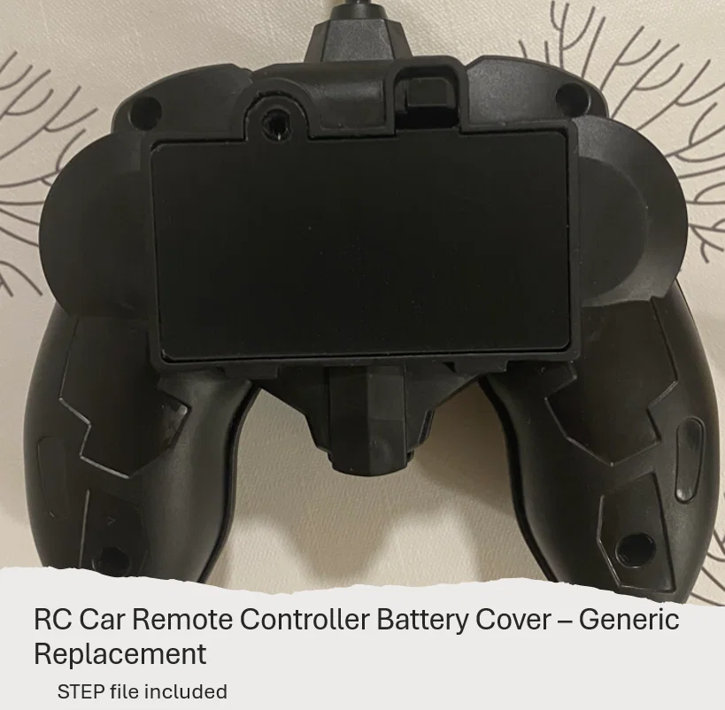 Nắp đậy pin thay thế đơn giản, tiện dụng cho tay cầm xe RC giá rẻ. Thiết kế dễ in, tiết kiệm nhựa, độ bền tốt. Tặng kèm file STEP để bạn thoải mái tùy chỉnh theo nhu cầu.