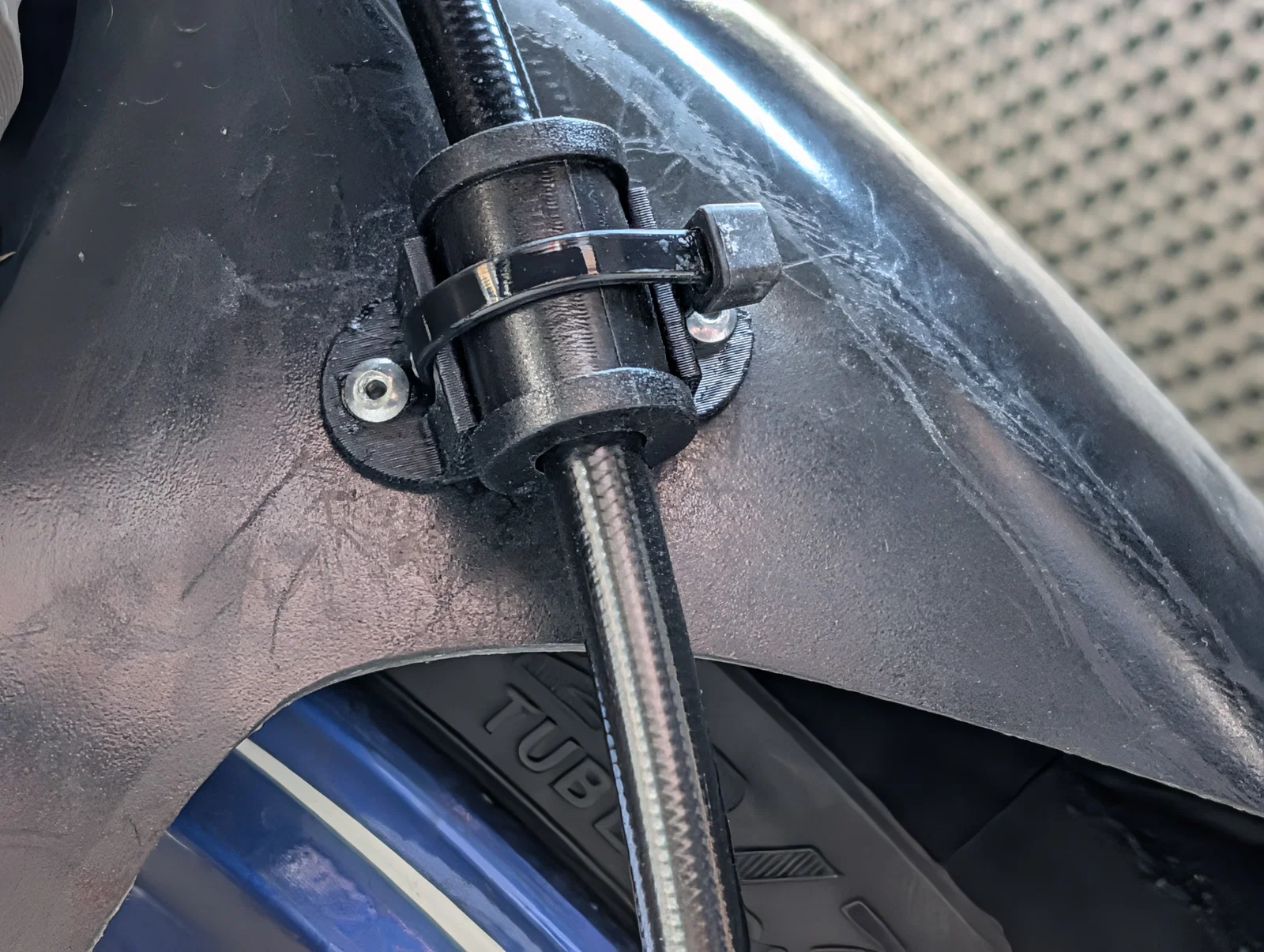 Phụ kiện này dùng để cố định phần ống bọc cao su của dây dầu thắng có đường kính 14 mm trên dè trước xe máy. Mình đã thử nghiệm thành công với dây dầu HEL trên xe GSX-R600 K8. Bạn cần chuẩn bị: Một sợi dây rút 4x1.5 mm (hoặc nhỏ hơn). Hai cái rive: thiết kế mặc định cho rive 3 mm, nhưng tùy vào độ chính xác của máy in mà bạn có thể cần dùng rive 2 mm. Hướng dẫn in: Mình sử dụng nhựa ASA vì loại này chịu nhiệt và kháng tia UV tốt. Hãy nhớ tắt hoặc giảm quạt làm mát để tăng độ kết dính giữa các lớp in khi dùng ASA. Bạn nên in nghiêng 90 độ sang một bên để tăng độ cứng cáp. Nếu khả năng bám dính giữa các lớp in chưa được tốt lắm thì cách đặt này sẽ hỗ trợ rất nhiều. * Không cần dùng support. Nguồn CAD có sẵn tại OnShape