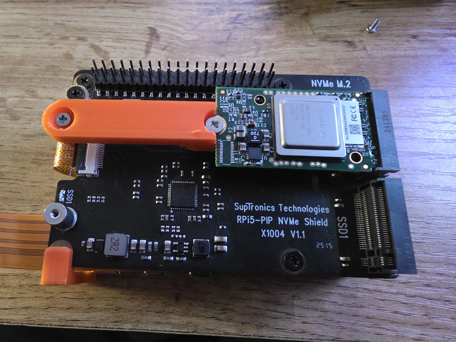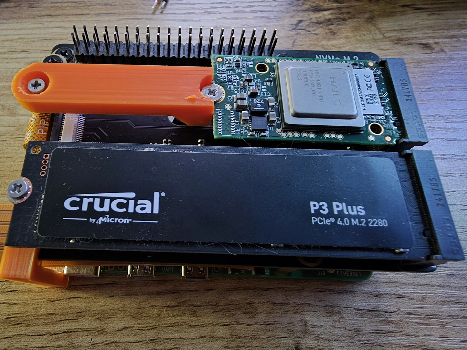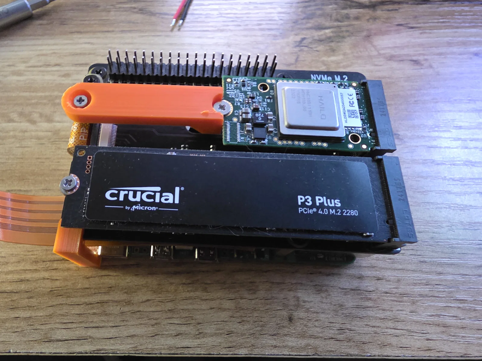 Mình cần một chiếc adapter để lắp bộ xử lý AI Edge Hailo 8 lên card M.2 trên Raspberry Pi 5. Vì không ưng ý với mấy giải pháp hiện có, mình đã tự thiết kế riêng cái này. Chắc chắn nó sẽ có ưu nhược điểm riêng so với những món đang bán trên thị trường.### Phần cứng cần thiếtBạn cần chuẩn bị thêm một con ốc cấy (heat set insert) loại M2x4 để cố định mọi thứ bằng vít.Mình đã dùng loại này: https://www.ruthex.de/en/products/ruthex-gewindeeinsatz-m2-70-stuck-rx-m2x4-messing-gewindebuchsenThiết kế của mình khá chắc chắn, từ lúc dùng tới giờ chưa thấy bị lỏng lẻo do rung lắc gì cả.### Hướng dẫn inMình in bằng nhựa PETG và không cần dùng support.### Lưu ýTrong hình ảnh bạn có thể thấy:- Bản thân cái M.2 bridge- Raspberry Pi 5- Geekworm X1004 Dual M.2 NVMe SSD Shield cho Raspberry Pi 5- Bộ xử lý Hailo 8- Ổ cứng Crucial P3 Plus 1TB