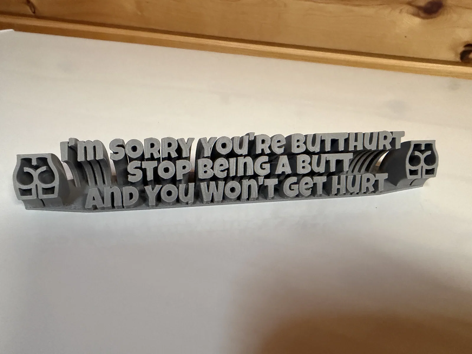 Bạn đang tìm kiếm một vật phẩm trang trí nhỏ gọn, mang tính giải trí cao và đầy cá tính để đặt trên bàn làm việc hay kệ sách? Mô hình chữ 3D với thông điệp đầy tính châm biếm "I'm sorry you're butthurt, stop being a butt and you won't get hurt" chính là lựa chọn hoàn hảo. Thiết kế này không chỉ là một món đồ vật đơn thuần mà còn là cách để bạn bày tỏ sự hài hước, đôi khi là một chút 'cà khịa' nhẹ nhàng đầy thú vị với bạn bè hoặc đồng nghiệp.
