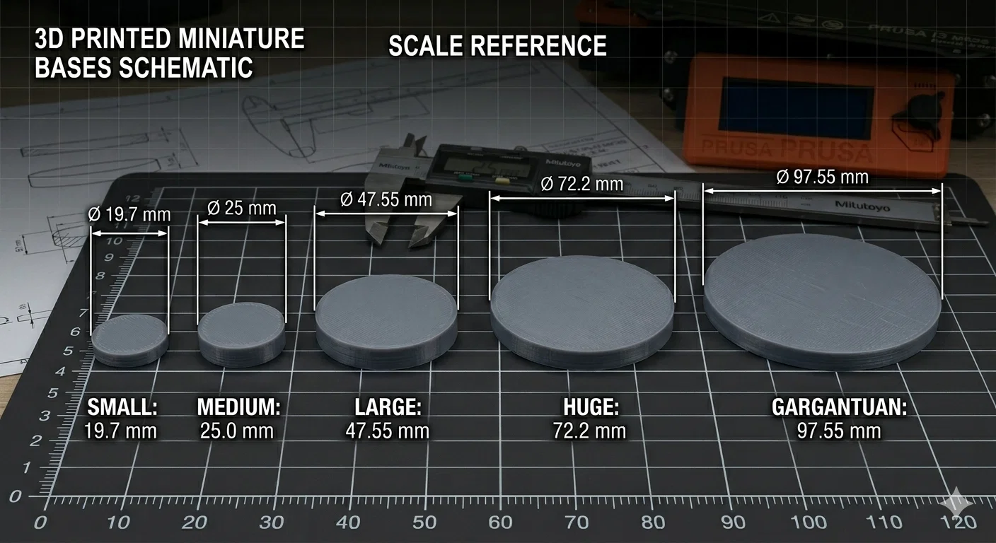 Đây là trọn bộ các file STL đế mini được lấy cảm hứng từ các mô hình Wizards of the Coast War of the Dragon Queen (2006) nguyên bản. Bộ đế này bao gồm năm kích thước tiêu chuẩn, được thiết kế để đảm bảo tính đồng nhất trên bàn chơi, với chiều cao thấp (đúng chuẩn gốc) là 3,3 mm để tạo sự ổn định và tiết kiệm vật liệu in. Một điểm mà nhiều người thường hiểu sai là làm đế bằng kích thước ô lưới D&D, trong khi thực tế các mô hình mini cần nhỏ hơn một chút để không bị vướng vào các mô hình xung quanh. Đây là hình ảnh các mô hình mình dùng để đo đạc các file này: Lưu ý rằng hầu hết các sinh vật hình người đều dùng đế kích thước "medium". Ở đây có Tordek (người lùn) dùng chung kích thước đế với người thường, blackspawn exterminator và hobgoblin talon of tiamat. Để làm tham chiếu, mô hình bonded fire summoner (nhân vật người cầm sách) có tỉ lệ 30mm (từ chân đến tầm mắt). Các kích thước đi kèm: Small: đường kính 19,7 mm Medium: đường kính 25 mm Large: đường kính 47,55 mm Huge: đường kính 72,2 mm Gargantuan: đường kính 97,55 mm Hiện nay đã có thêm các kích thước Gargantuan, nhưng lưu ý rằng ngay cả Aspect of Tiamat cũng dùng đế kích thước Huge. Các mini Gargantuan thường sử dụng đế tùy chỉnh riêng. Tất cả các đế đều là hình trụ đơn giản, gọn gàng, rất lý tưởng cho: Mô hình RPG (D&D, Pathfinder, v.v.) Các mini tùy chỉnh và mini thay thế Ghi chú thiết kế: Tỉ lệ chuẩn giống hệt các đế WotC cổ điển Tiết kiệm vật liệu tối đa Mặt đáy phẳng giúp bám bàn in dễ dàng Mẹo in ấn: Không cần support Đặt nằm phẳng trên bàn in * Dùng brim nếu gặp vấn đề độ bám dính với các đế nhỏ Nếu anh em đang muốn tái tạo lại các bộ sưu tập cổ điển hoặc cần sự đồng nhất về kích thước đế cho dàn mini của mình, bộ này đáp ứng từ kích thước Tiny đến Huge.