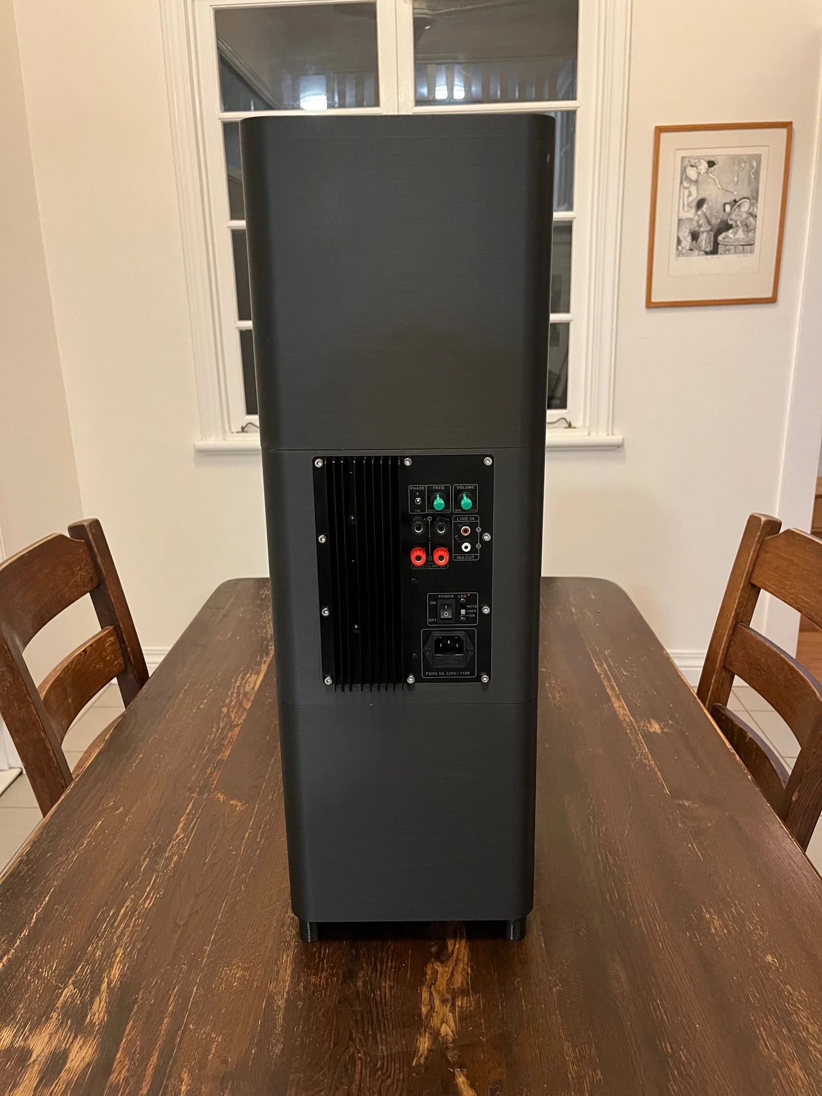 Chiếc sub này khá lớn, cao khoảng 70cm. Thay vì đặt đứng kiểu đánh xuống sàn (down-firing), anh em có thể đặt nằm ngang. Tôi đã thiết kế sẵn mặt lưới bảo vệ cho trường hợp này (nếu đặt đứng thì không cần dùng).