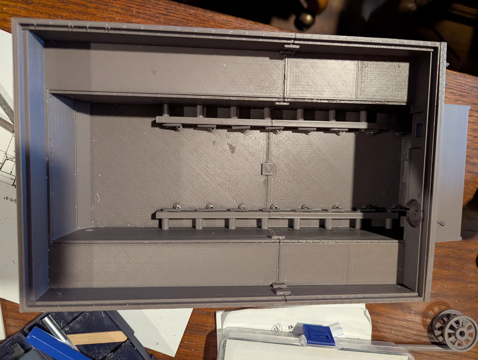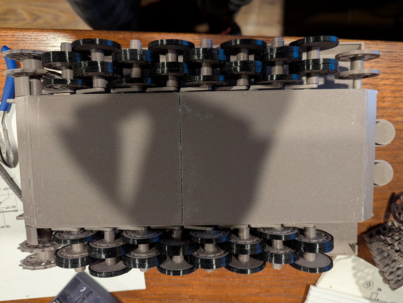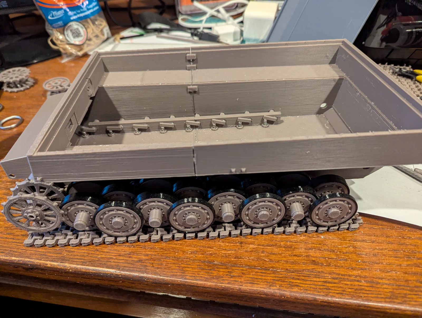 Đây là mô hình khá lớn với khoảng 350 chi tiết và tốn hơn 1kg nhựa. Mình ưu tiên thiết kế các chi tiết đơn giản nhưng cần lắp ráp nhiều để giảm bớt độ phức tạp khi in. Kết quả là mô hình có chất lượng khá tốt, chuyển động lăn êm ái và hệ thống treo hứa hẹn sẽ hoạt động tốt nếu sau này bạn muốn nâng cấp lên điều khiển từ xa (RC). Có lẽ mình sẽ phải in lại phần thân dưới khi bắt đầu giai đoạn RC vì trọng lượng của pin và linh kiện điện tử sẽ ảnh hưởng đến cân bằng của xe, cần chỉnh lại lò xo và giá đỡ.