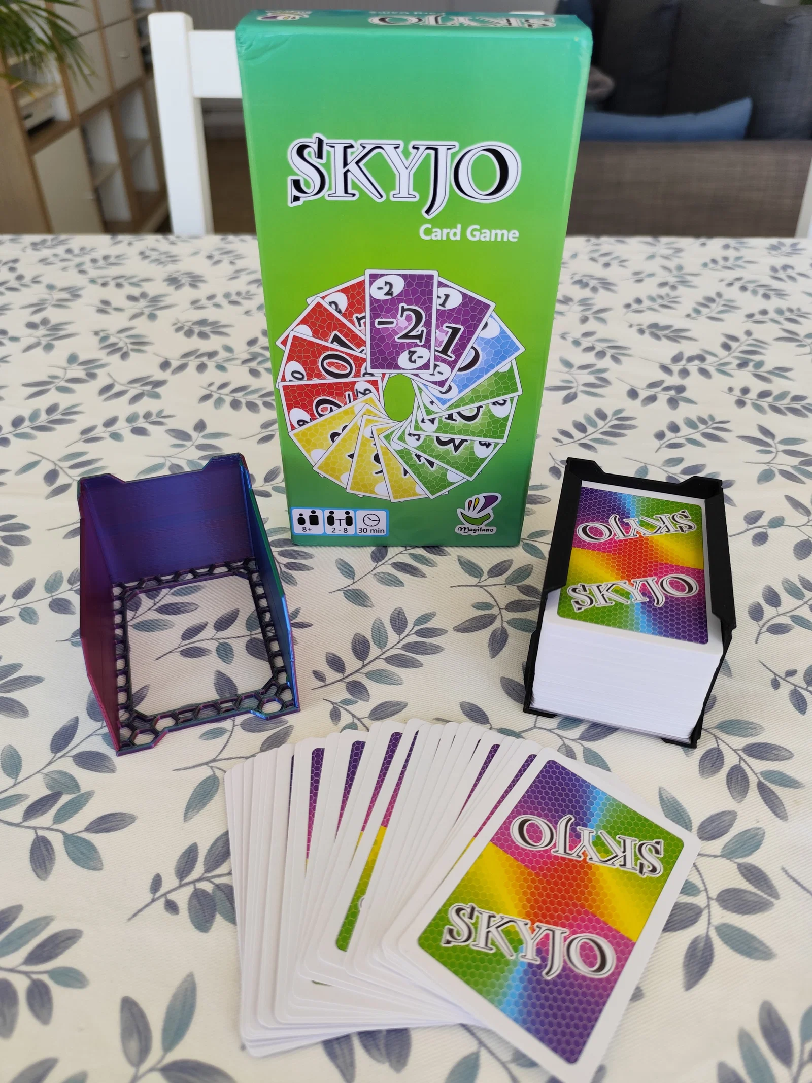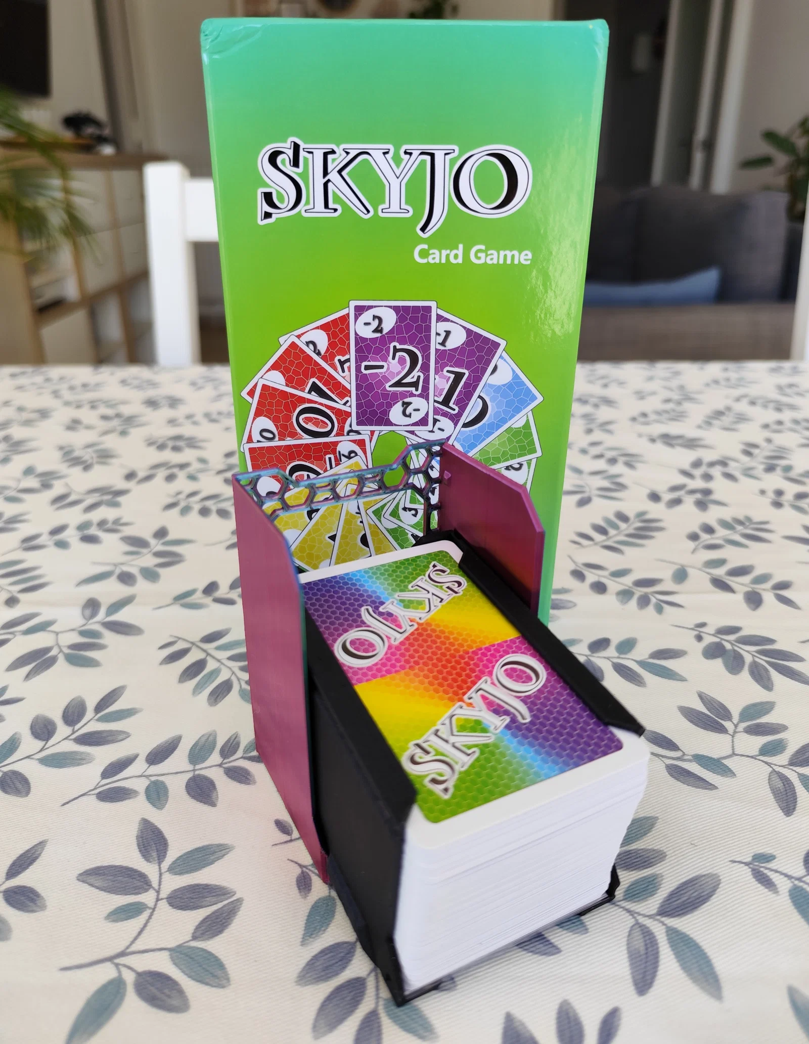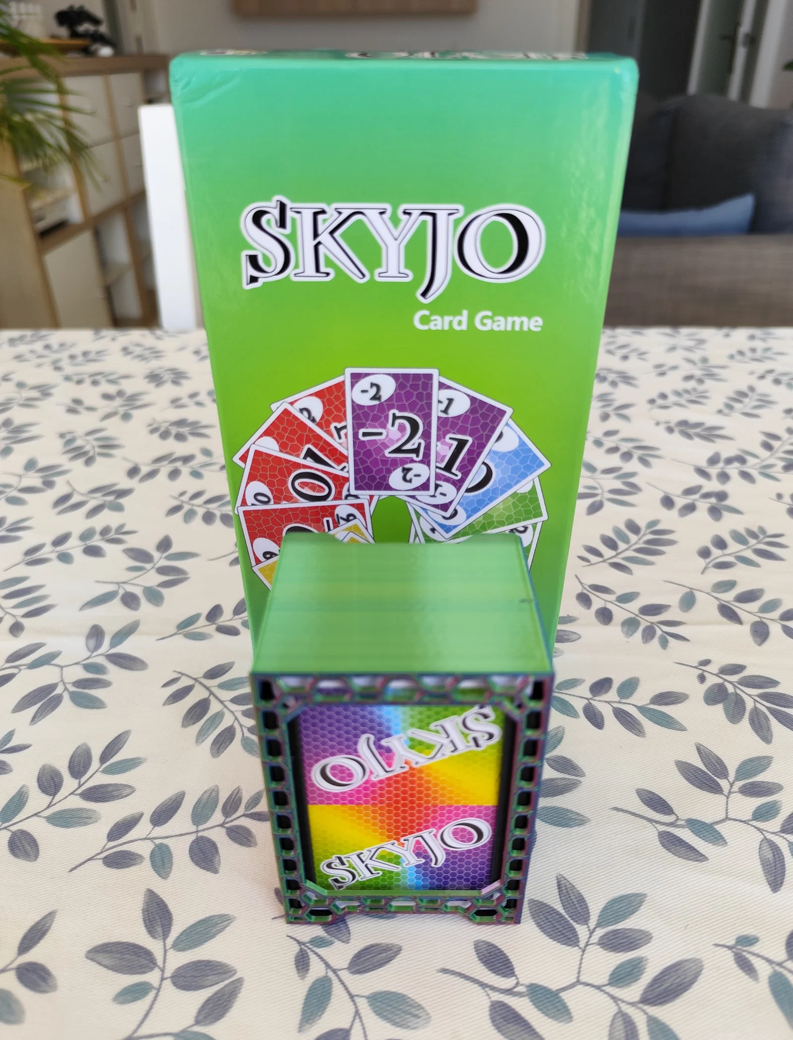 Đây là hộp đựng bài di động được thiết kế riêng cho trò chơi Skyjo (phiên bản 2015, kích thước thẻ 56x87mm), sử dụng mẫu Transformer Card Box cực kỳ tiện lợi. Hộp này được làm để vừa khít với những bộ bài không bọc sleeve.