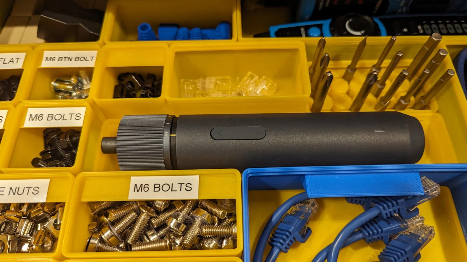 5x1 Giá đỡ cho các công cụ tròn tương thích với hệ thống tổ chức Gridfinity phổ biến. Tôi đã làm nó cho chiếc tua vít điện khá lớn của mình, nhưng đường kính công cụ phù hợp với chiều rộng gridfinity, vì vậy nó sẽ hoạt động tốt cho bất kỳ công cụ tròn nào vừa vặn trong khe 5x1. Thông tin chi tiết hơn về hệ thống Gridfinity: