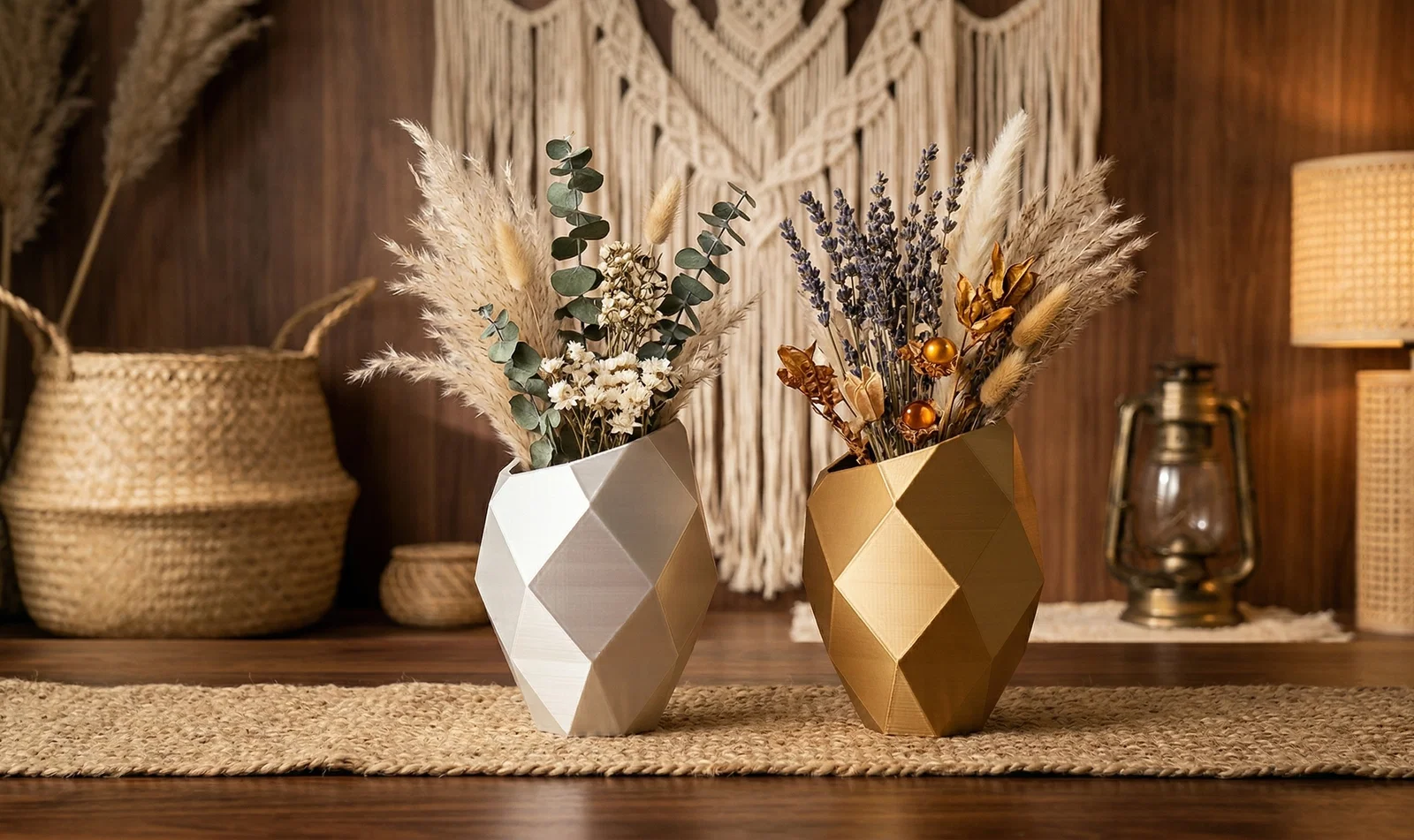 bình hoa góc cạnh, trang trí nhà cửa hình học, bình hoa bất đối xứng, bình hoa ánh kim vàng, trang trí màu bạc, phong cách boho chic, mộc mạc hiện đại, tâm điểm bàn ăn, bình hoa khô, thẩm mỹ in 3D, nhà cửa đương đại, trang trí chiết trung, trang trí kệ
