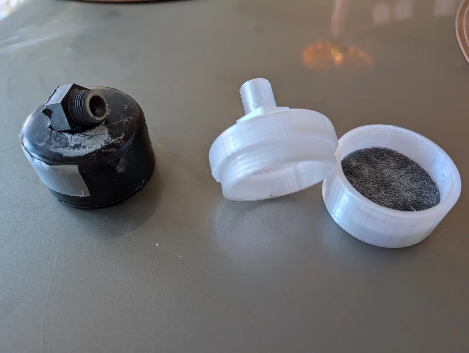 Cái vỏ lọc gió zin theo máy nén khí 8 gallon màu đen của Harbor Freight được làm bằng nhựa, bên trong có miếng mút lọc. Khi bạn vô tình va quẹt làm gãy vỏ, máy sẽ mất bộ phận lọc ở đầu hút. Đây là thiết kế vỏ lọc có hình dáng tương tự, bạn thậm chí có thể tận dụng lại miếng mút lọc cũ, nhưng điểm cải tiến là nó có thể tháo rời bằng ren để bạn dễ dàng thay thế lõi lọc sau này.