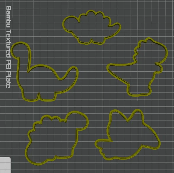 Bộ khuôn cắt bánh hình khủng long với thiết kế dạng khung viền đơn giản. Mẫu này được tùy chỉnh từ thiết kế gốc, rất phù hợp để làm bánh quy hoặc cắt tạo hình cho món Dino Nuggets của bạn.