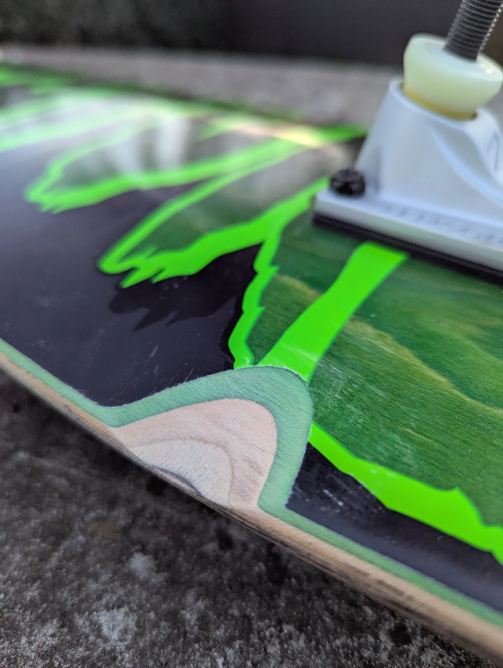 Chạy máy khoan ở tốc độ vừa phải và hạ thấp dần xuống ván. Bạn nên chà nhám cho đến khi vừa chạm tới lớp gỗ giữa (thường được nhuộm màu trên nhiều tấm ván trượt đường phố) và hoàn thiện bằng tay, tốt nhất là dùng giấy nhám mịn hơn. Tham khảo hình ảnh, lớp giữa trên ván Creature là màu đen.