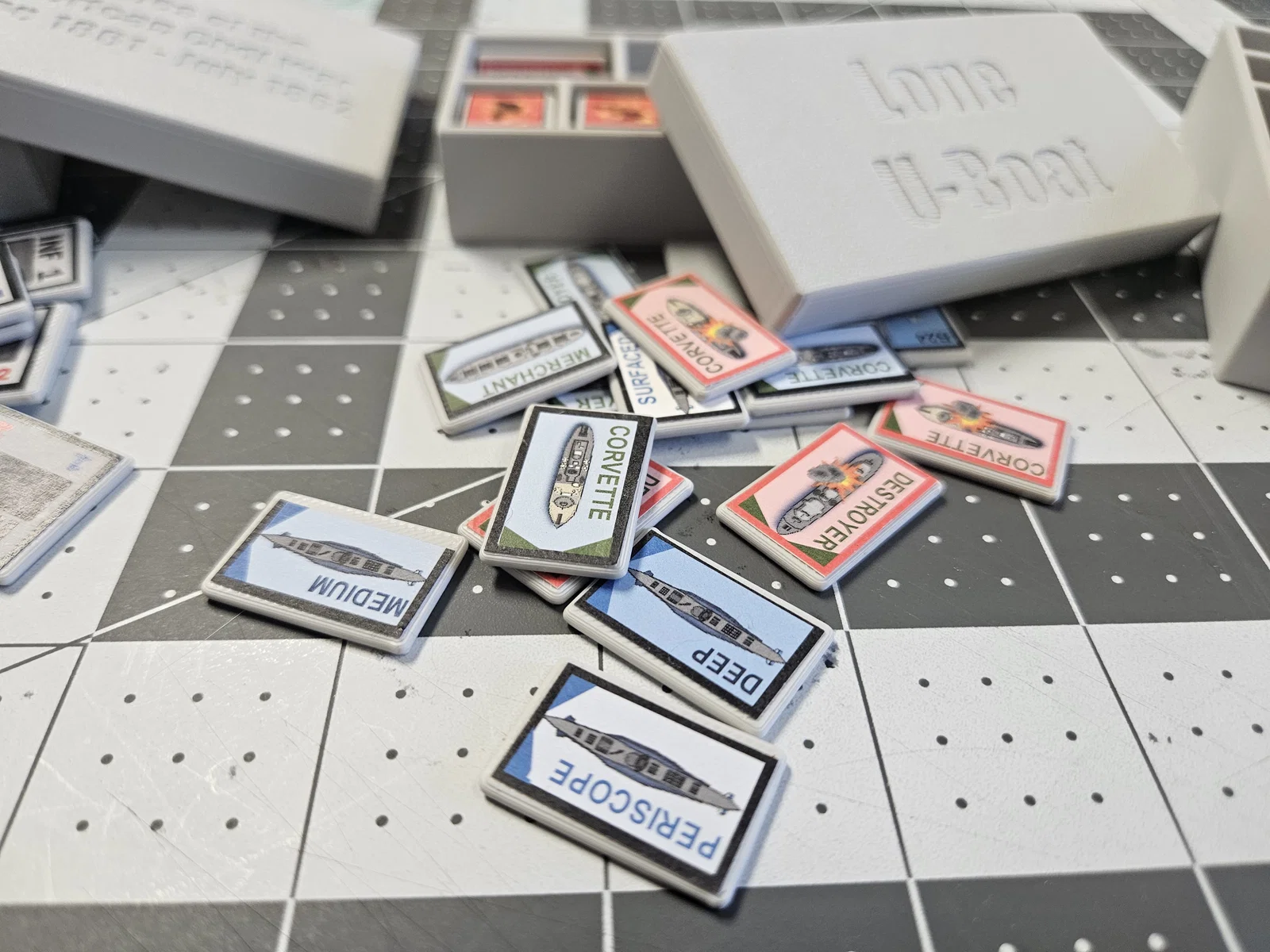 Đây là các đế cho thẻ đếm (counter base) dày 2 mm cùng với hộp và nắp đậy để lưu trữ cho trò chơi wargame Lone U-Boat của Mike Lambo. Đây là phần đế dành cho các thẻ đếm gốc của trò chơi mà bạn có thể tìm thấy tại đây: https://boardgamegeek.com/filepage/310717/lone-u-boat-counters Số lượng sau tên file là số lượng bạn cần in. Để gắn các thẻ đếm, mình dùng dao cắt xoay (rotary cutter) cắt chúng ra, đặt úp xuống một miếng bìa cứng rồi xịt keo Super 77 hai lớp. Sau đó mình ép chúng vào mặt sau của đế và phủ nhẹ một lớp sơn Rust-Oleum matte clear. Tuy hơi mất công chút nhưng mình rất ưng ý với kết quả cuối cùng. Cảm ơn người dùng Minakami_Yuki trên BoardGameGeek đã truyền cảm hứng cho bộ đế và hộp này!