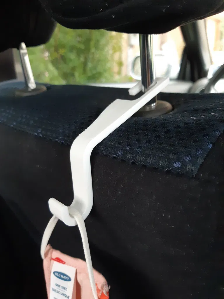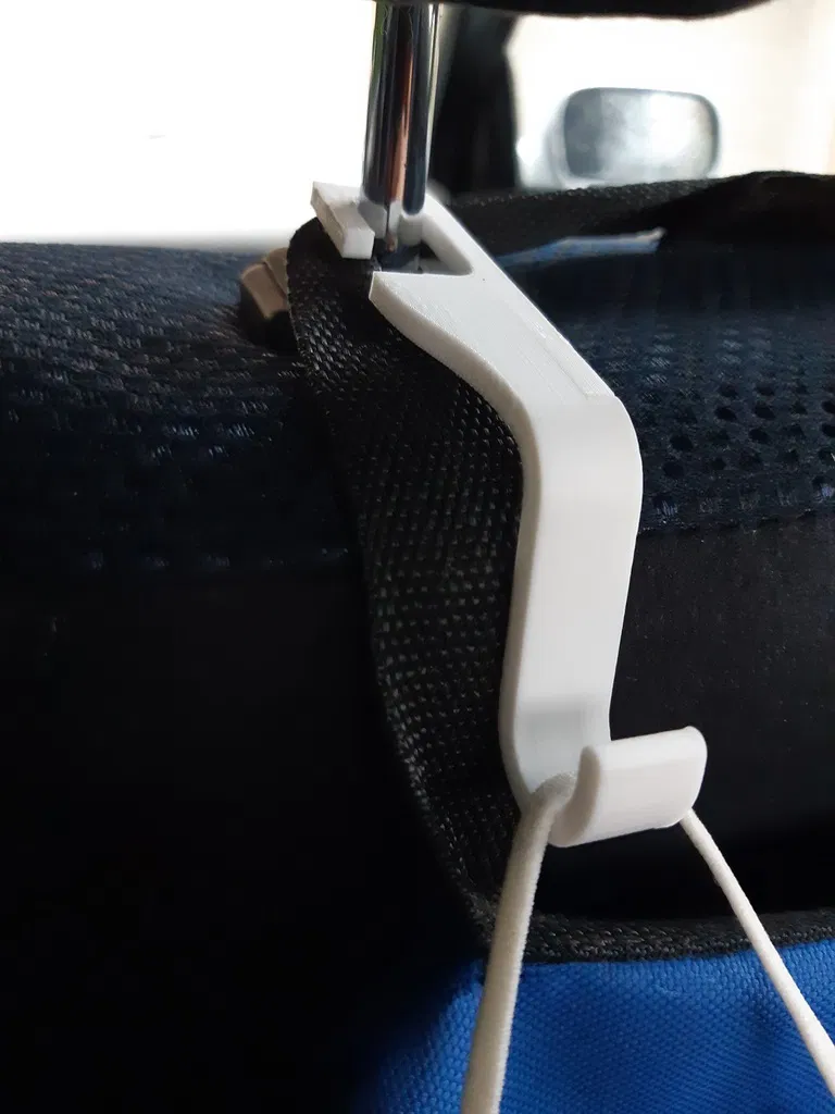 Đây là lần đầu mình in bằng PETG đó! Mình thiết kế một cái móc nhỏ gọn, dùng để treo vào thanh dựa đầu ghế trên xe hơi của mình. Bản V2 ngắn hơn 10mm ở phần gắn vào thanh dựa đầu.
