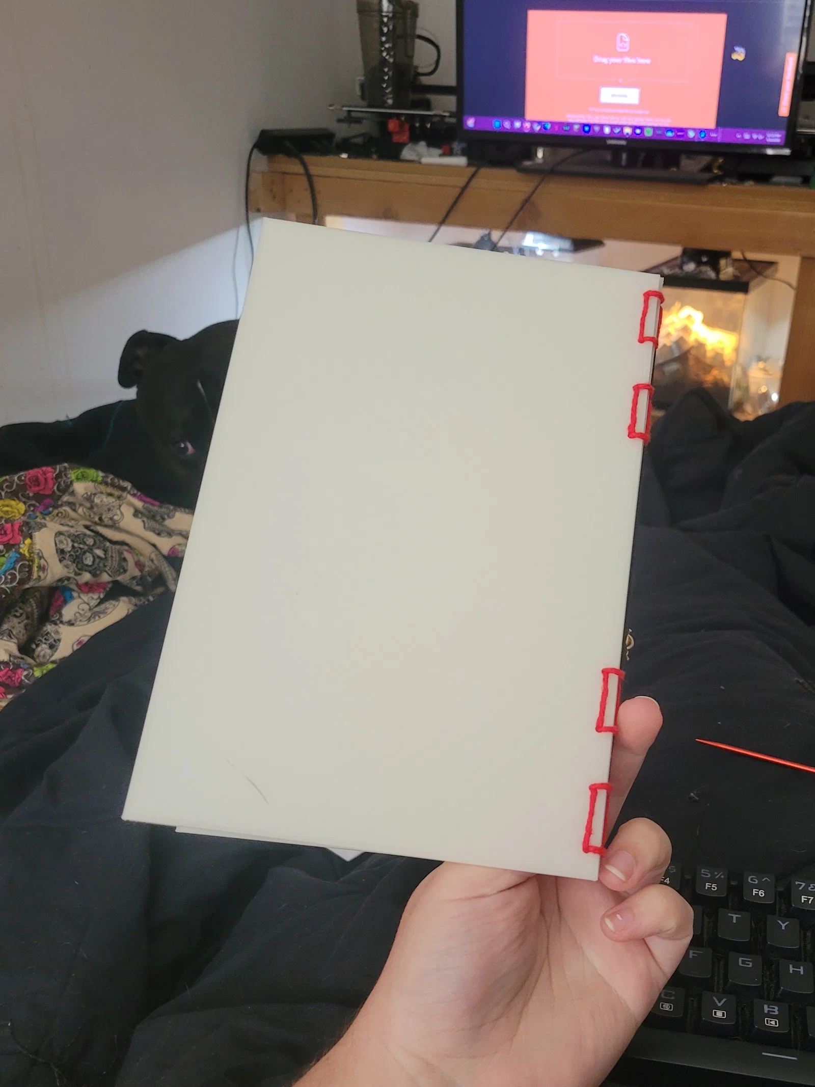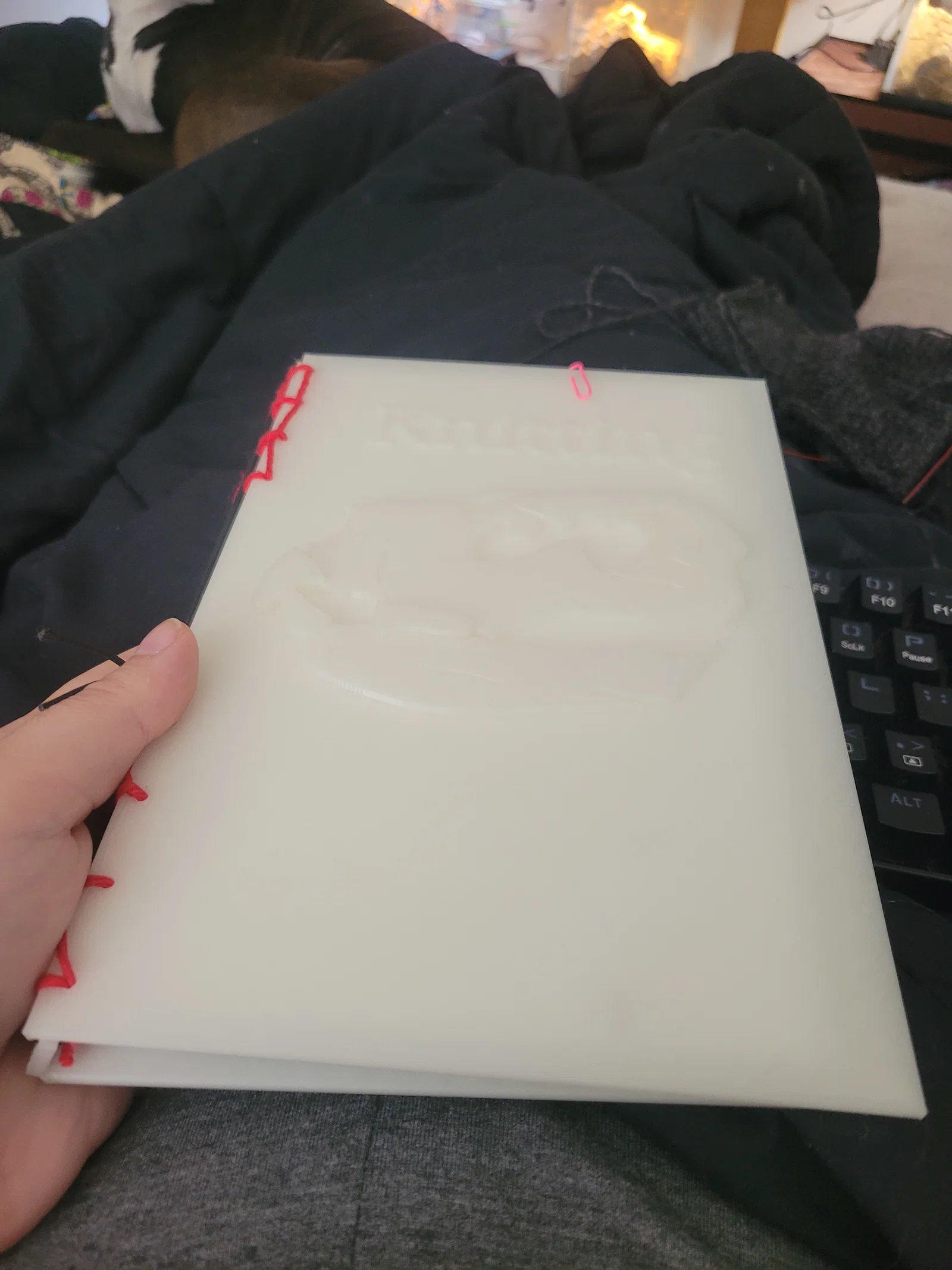 Phần gáy và bìa cho sổ tay khổ Half Letter. Kích thước này vừa vặn với giấy khổ US Letter (8.5x11 inch) khi gấp đôi lại (5.5x8.5 inch). Các lỗ ở trên cùng và dưới cùng cho phép bạn xỏ dây thun qua để tạo thành một cuốn sổ kiểu "travelers notebook". Mình đã thử xỏ được ba sợi dây thun vào (dù lúc đó mình cắt dây hơi ngắn nên thắt nút hơi khó) để có thể gắn thêm các cuốn sổ nhỏ khổ Half Letter (loại sổ đóng kim của mình) vào trong. VẬT LIỆU - Dây thun Len hoặc chỉ Kim khâu hoặc kim đan